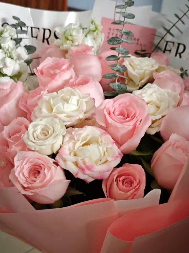 送货及时,鲜花新鲜,就是实物比图片看上去要偏小一点吧,总的来说还算可以