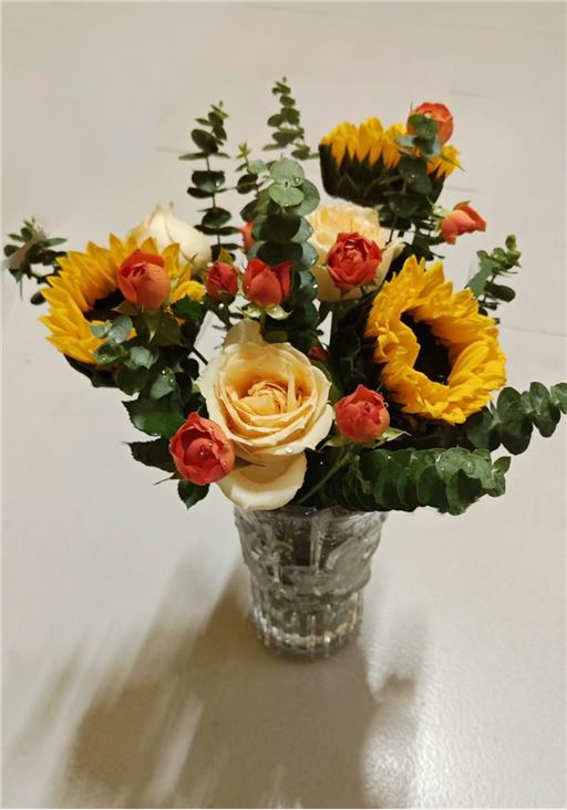 向日葵🌻,玫瑰[玫瑰],各三支,多支小玫瑰和配叶。