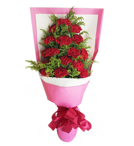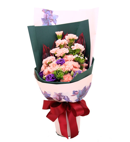 花材:粉色康乃馨19枝,紫色洋桔梗、红铁叶少许至花束饱满。
