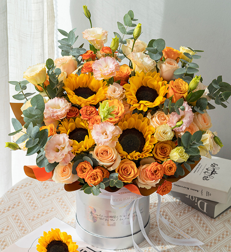 - 推荐花材:橙色玫瑰 + 黄色小雏菊 + 尤加利叶