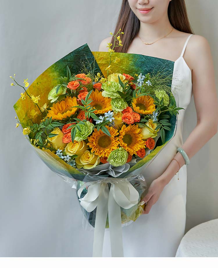 花束推荐:橙色系治愈系花束(如橙色郁金香 + 香槟玫瑰 + 雪柳)