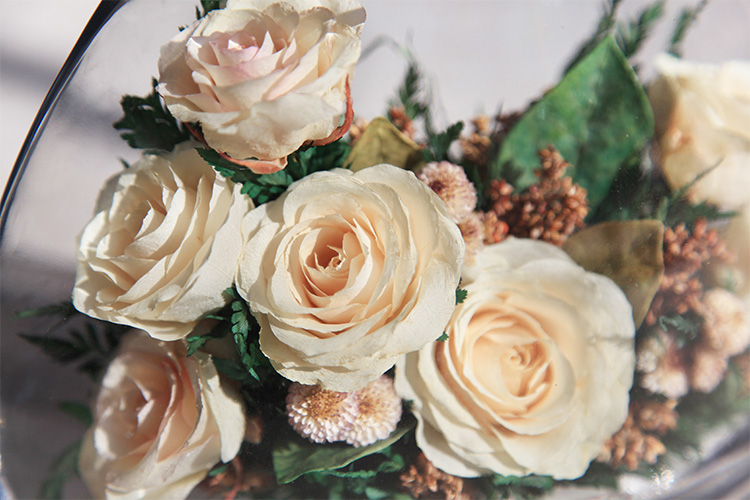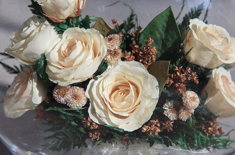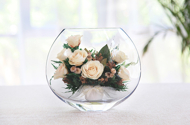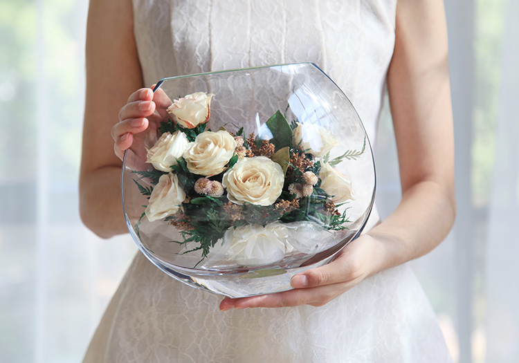 形态,经泰国花艺师精妙构思与巧手装扮,封入精美玻璃