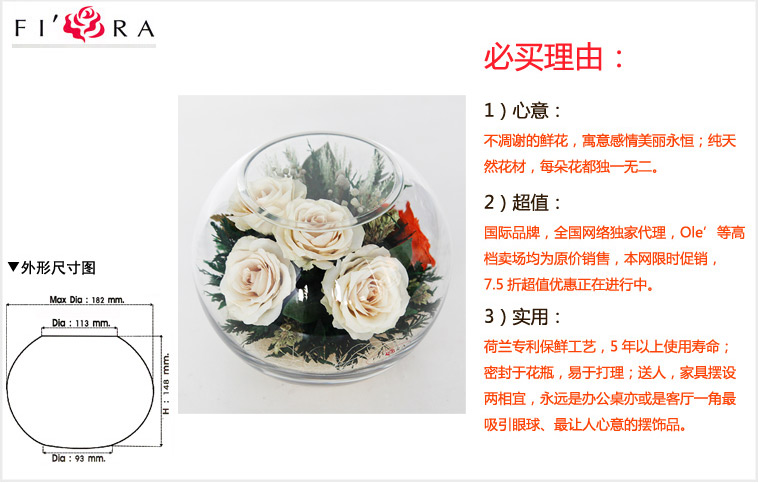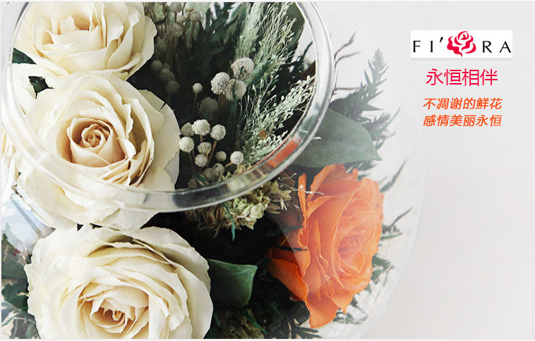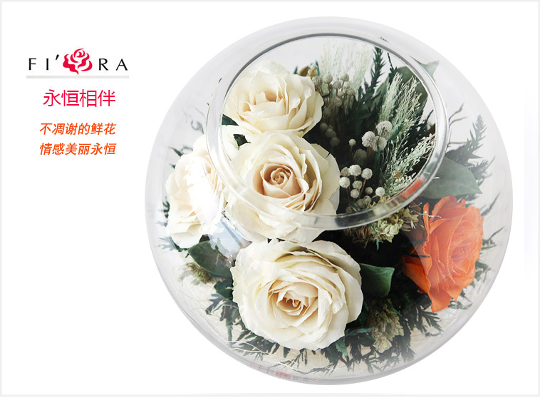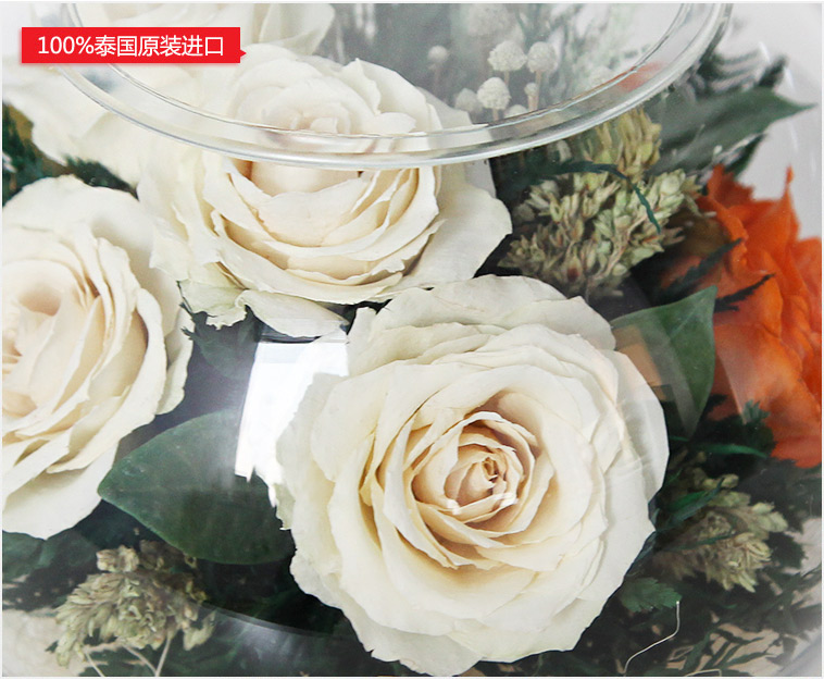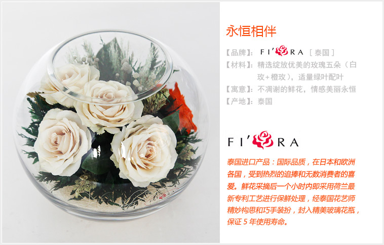 精选绽放优美的玫瑰5枝,配叶适量,在采摘后一个小时内用荷兰最新专利工艺处理,完整保留鲜花色泽和形态,经泰国花艺师精妙构思与巧手装扮,封入精美玻璃花瓶,保证产品使用寿命5年以上。