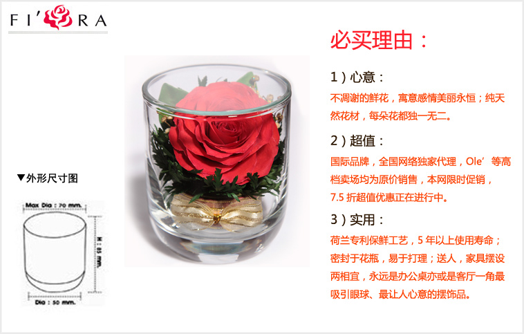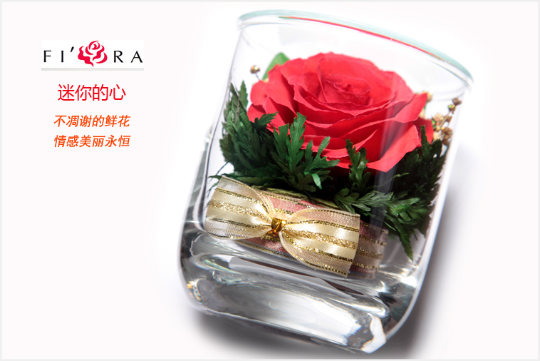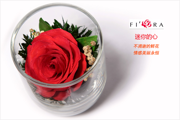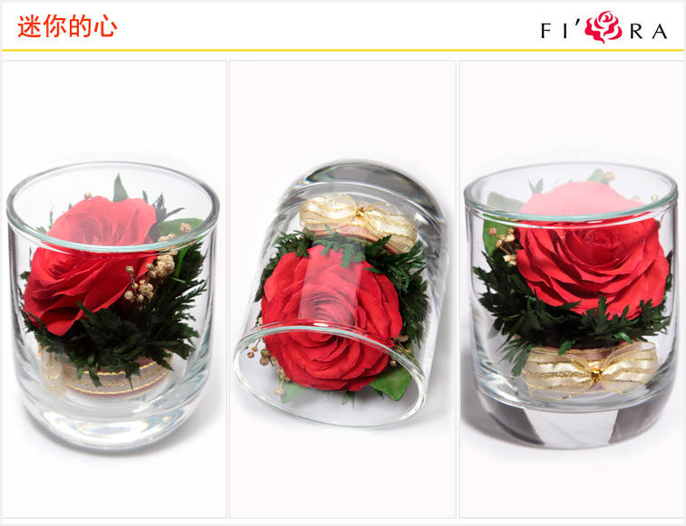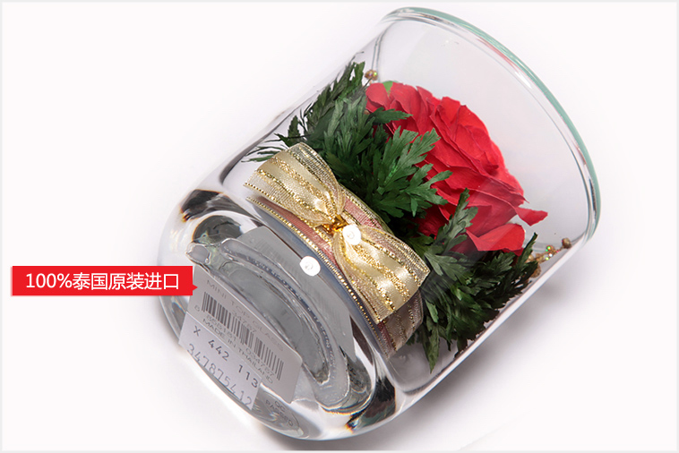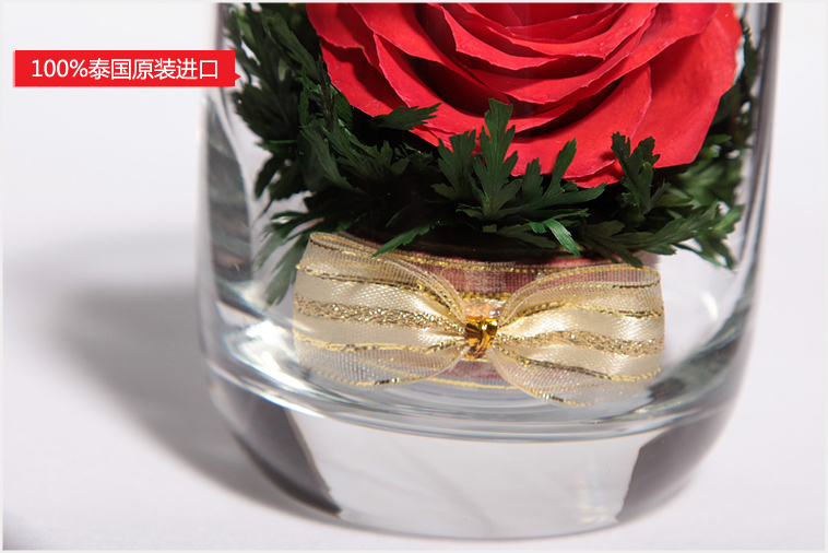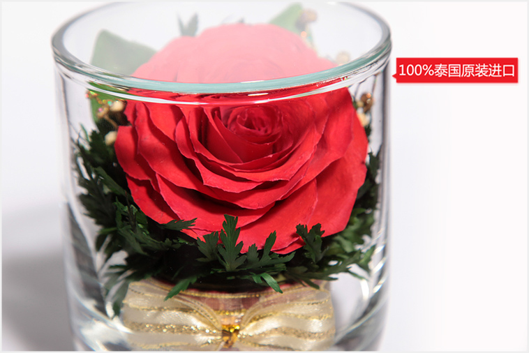 精选绽放优美的红玫瑰一枝,配叶适量,在采摘后一个小时内用荷兰最新专利工艺处理,完整保留鲜花色泽和形态,经泰国花艺师精妙构思与巧手装扮,封入精美玻璃花瓶,保证产品使用寿命5年以上。