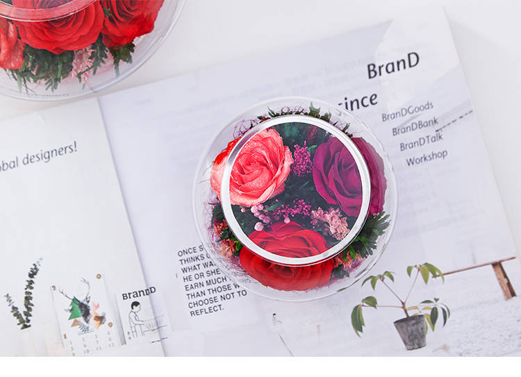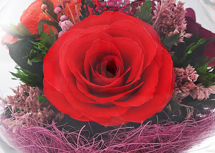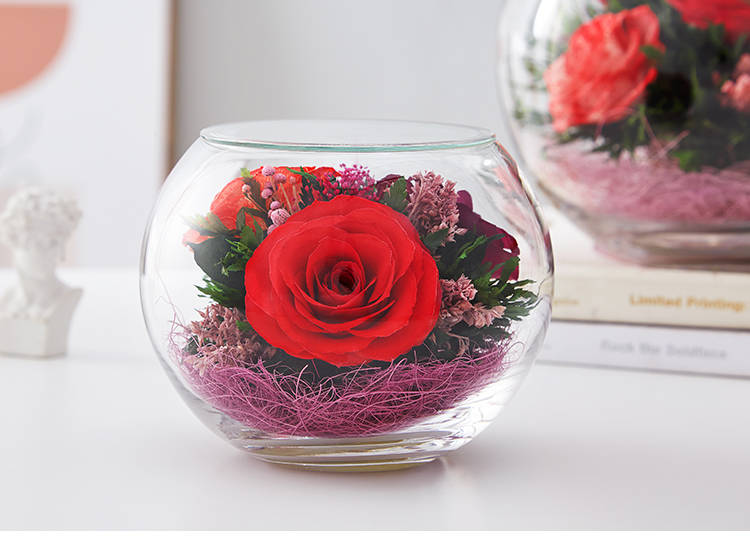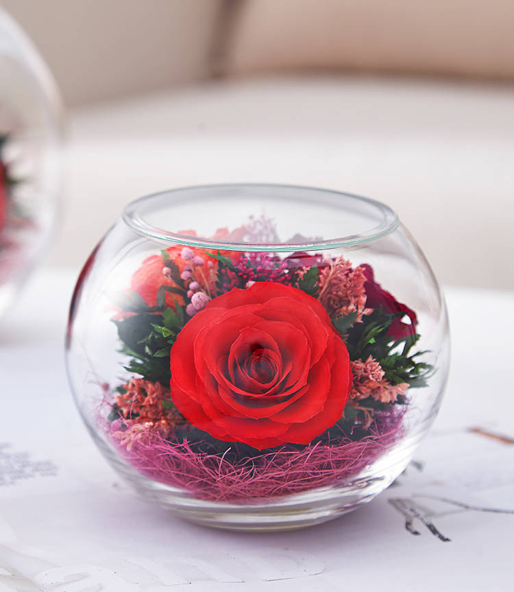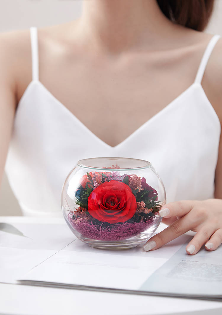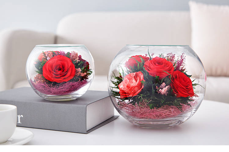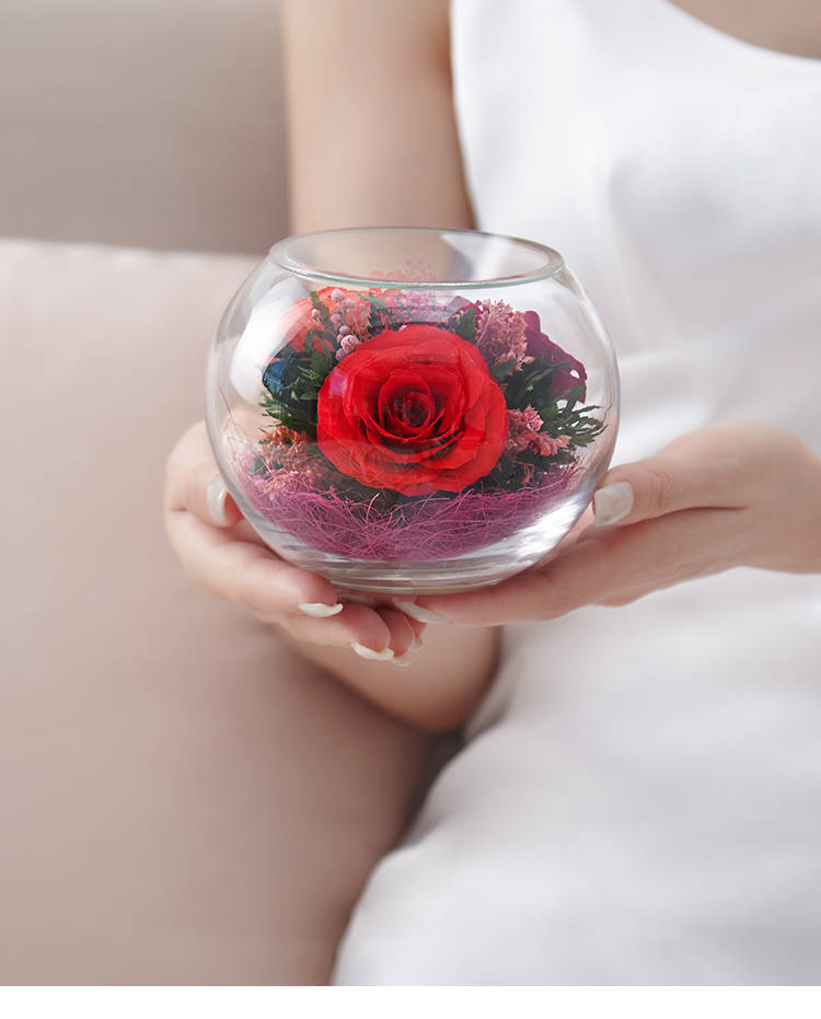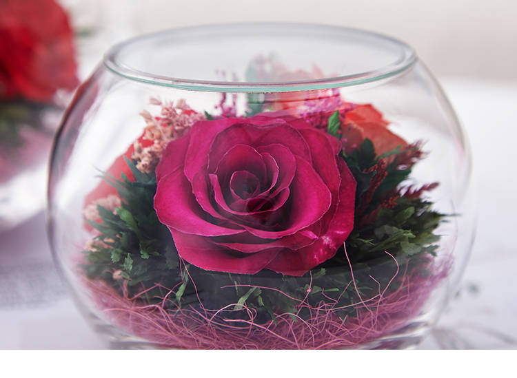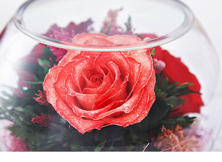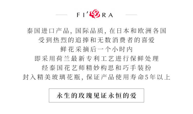 精选绽放优美的玫瑰三枝,配叶适量,在采摘后一个小时内用荷兰最新专利工艺处理,完整保留鲜花色泽和形态,经泰国花艺师精妙构思与巧手装扮,封入精美玻璃花瓶,保证产品使用寿命5年以上。