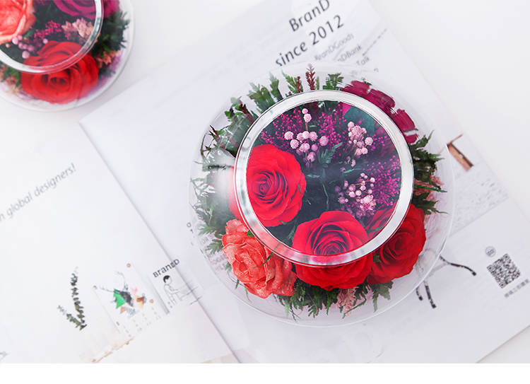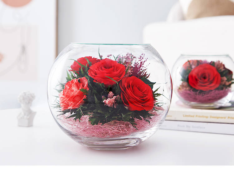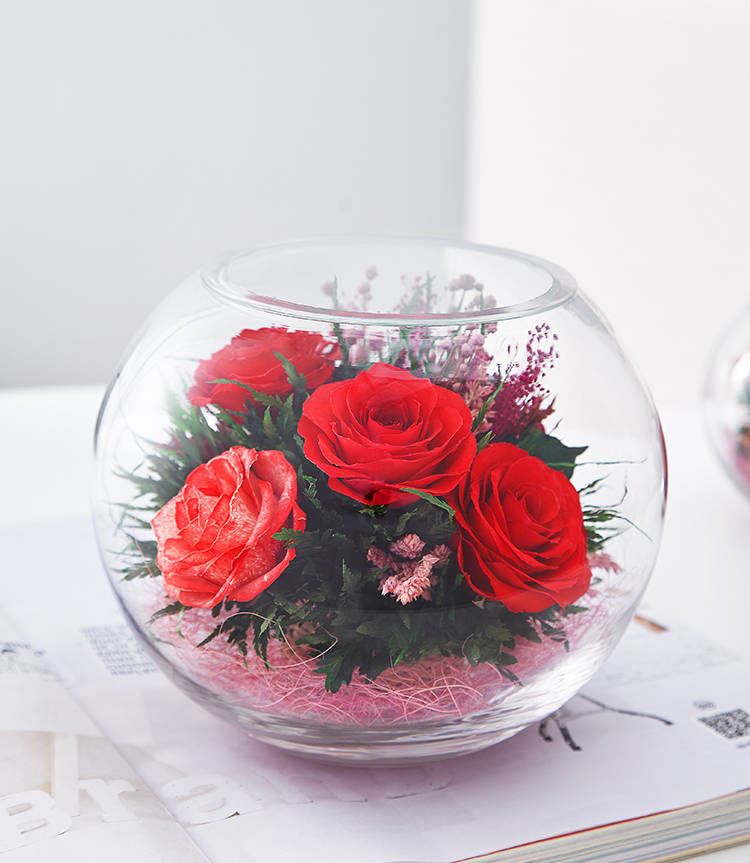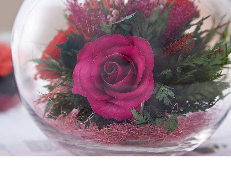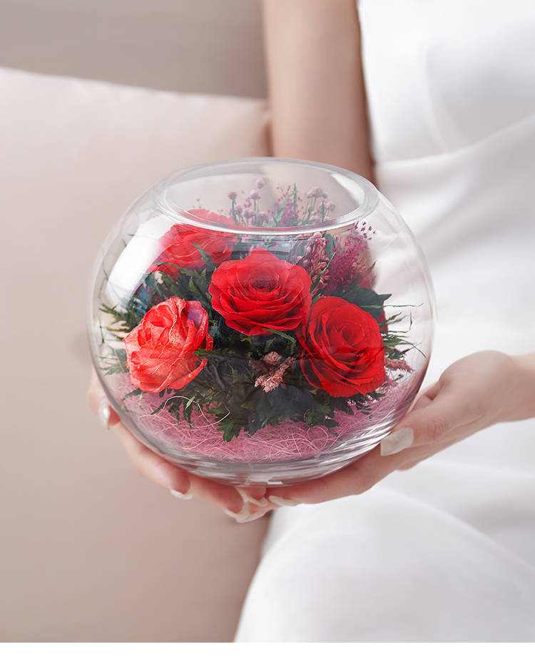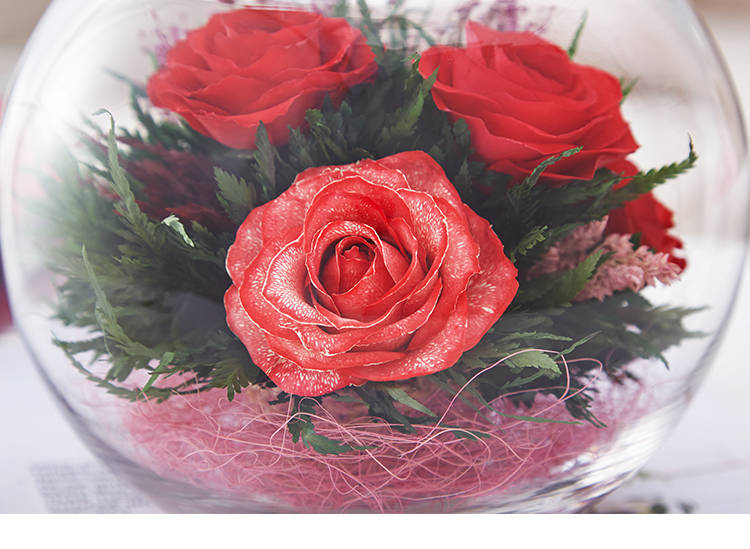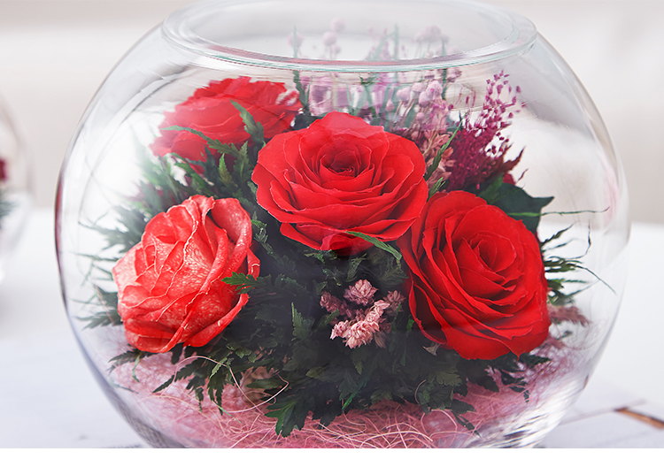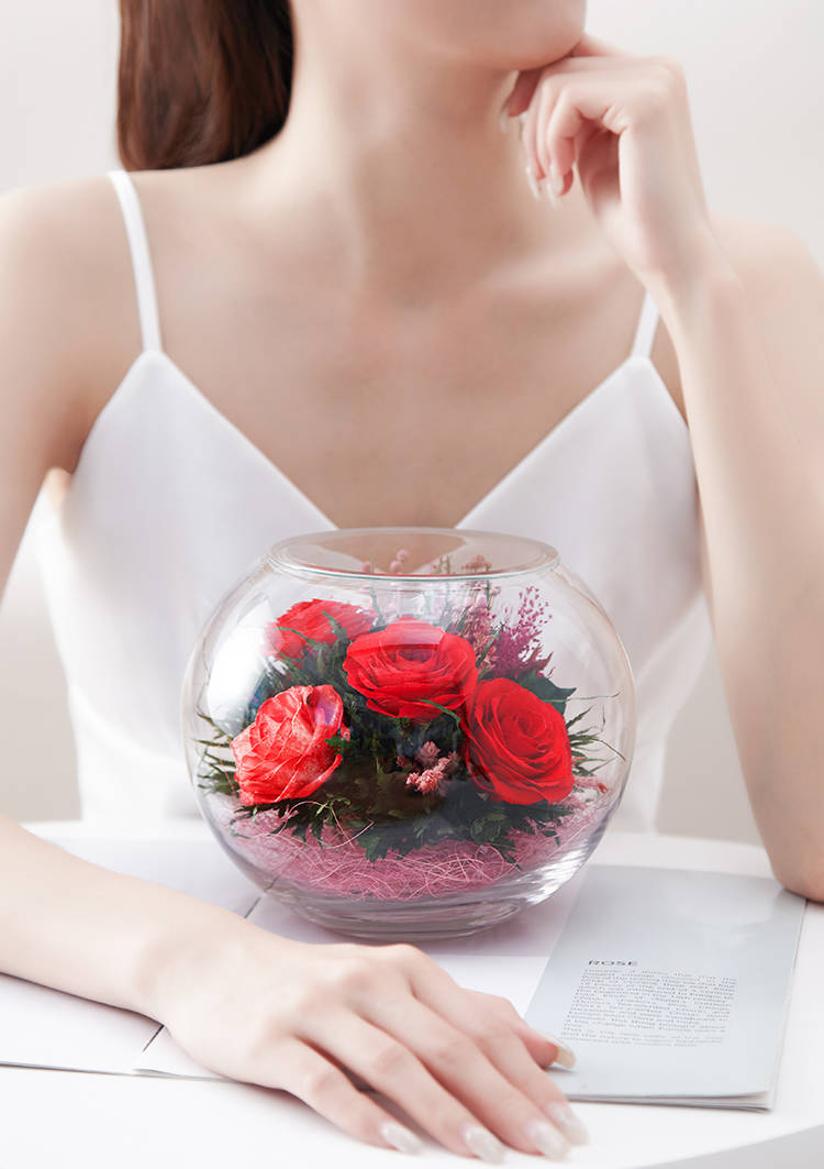 精选绽放优美的玫瑰5枝,配叶适量,在采摘后一个小时内用荷兰最新专利工艺处理,完整保留鲜花色泽和形态,经泰国花艺师精妙构思与巧手装扮,封入精美玻璃花瓶,保证产品使用寿命5年以上。
