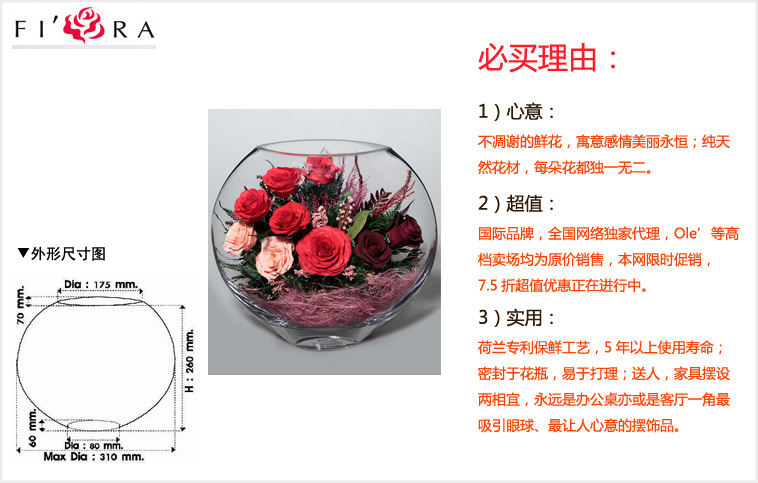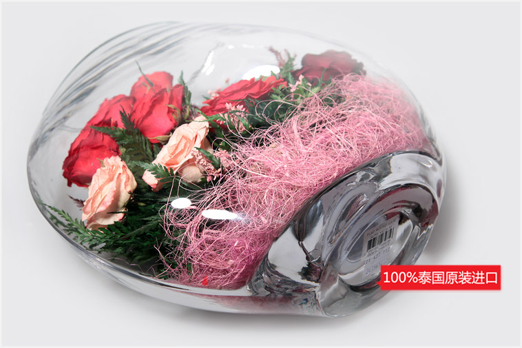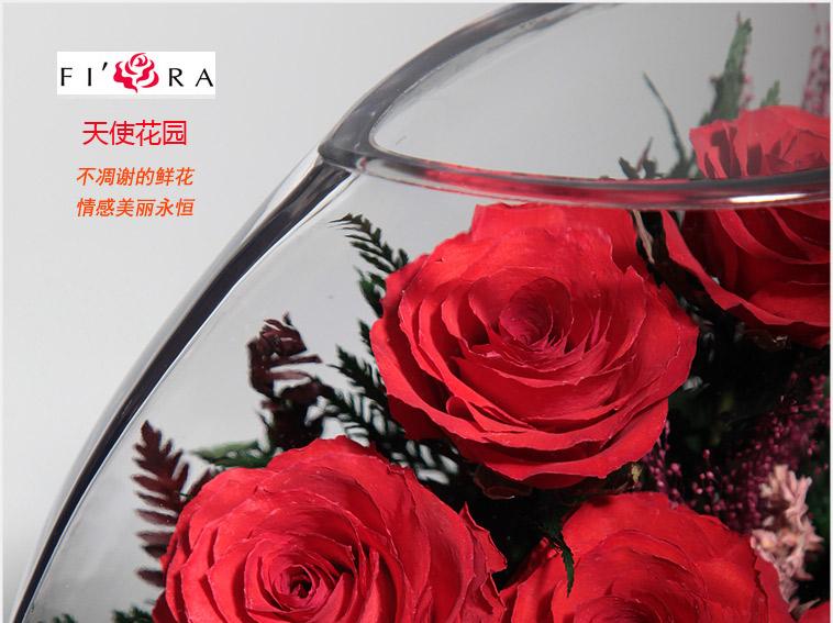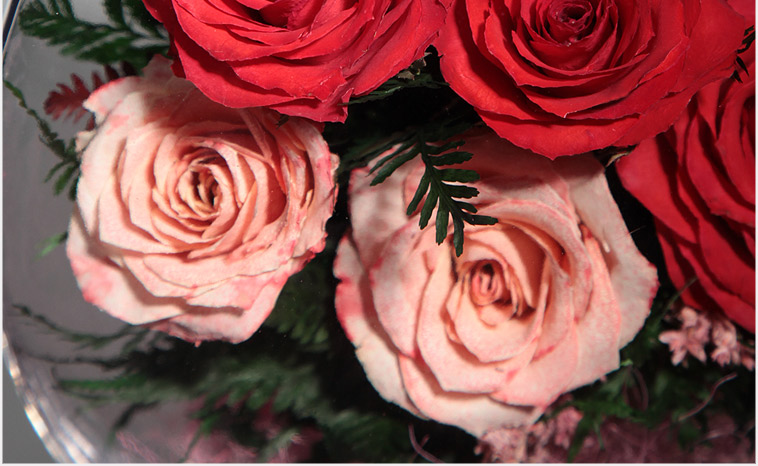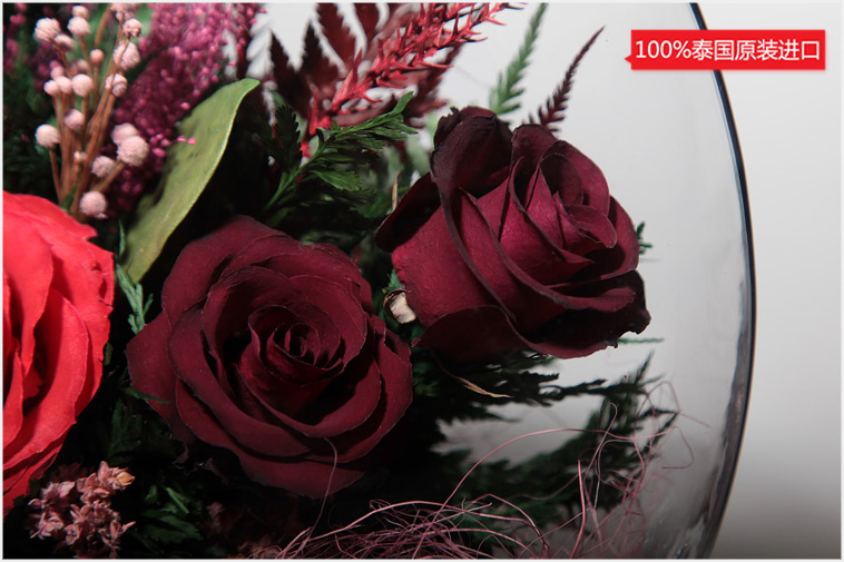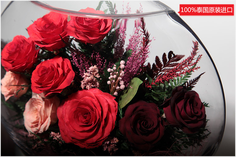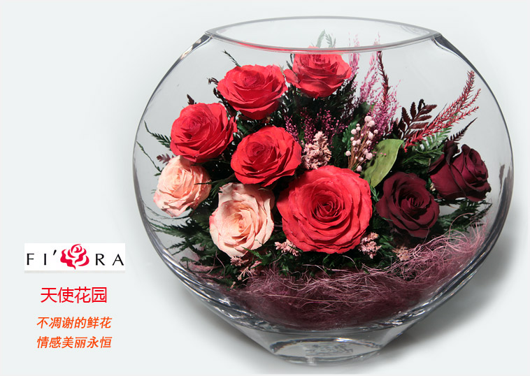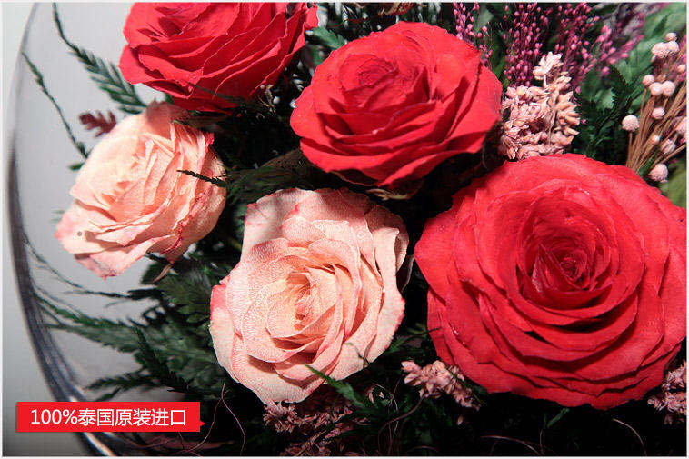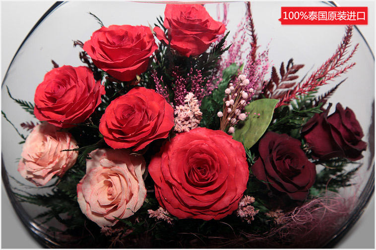 精选绽放优美的玫瑰9枝,红玫5枝+彩玫2枝+紫玫2枝,配叶适量。在采摘后一个小时内用荷兰最新专利工艺处理,完整保留鲜花色泽和形态,经泰国花艺师精妙构思与巧手装扮,封入精美玻璃花瓶,保证产品使用寿命5年以上。