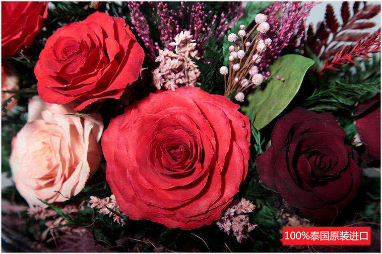 进口保鲜花,红玫5枝,彩玫5枝,紫玫2枝,5年不凋谢