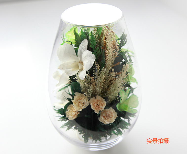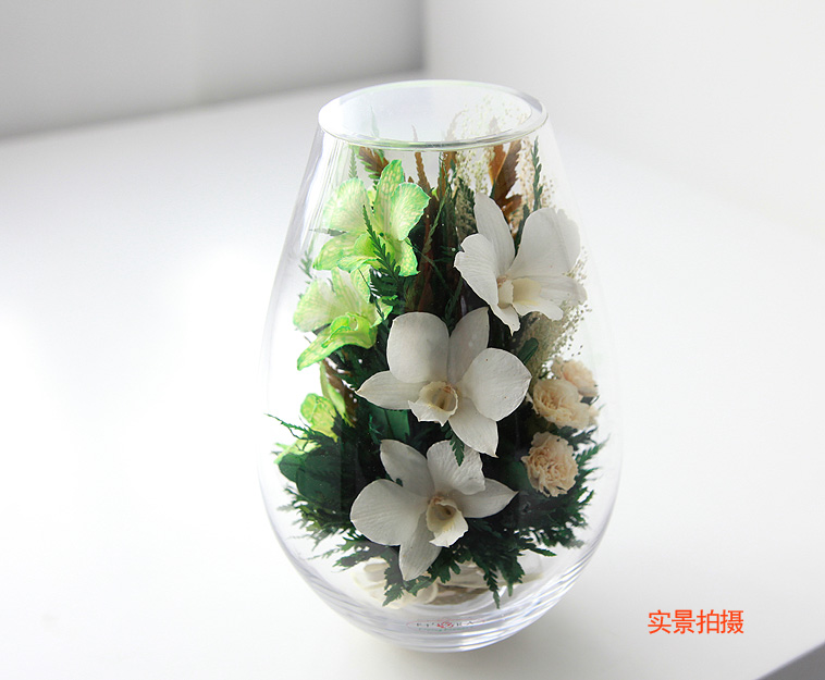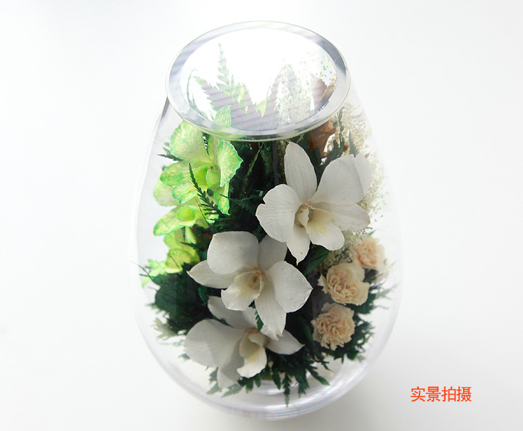 椭圆型兰花保鲜花,尺寸:宽169mm(Max.Dia),高248mm。精选兰花,加上配花,叶材,。在采摘后一个小时内用荷兰最新专利工艺处理,完整保留鲜花色泽和形态,经泰国花艺师精妙构思与巧手装扮,封入精美玻璃花瓶,保证产品使用寿命5年以上。