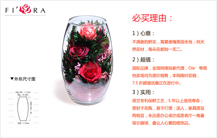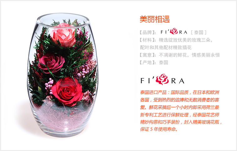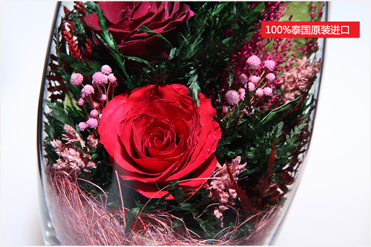 高身圆柱瓶进口保鲜花:精选绽放优美的三朵玫瑰(红玫+彩玫+紫玫),丰满配花,在采摘后一个小时内用荷兰最新专利工艺处理,完整保留鲜花色泽和形态,经泰国花艺师精妙构思与巧手装扮,封入精美玻璃花瓶,保证产品使用寿命5年以上。