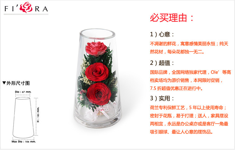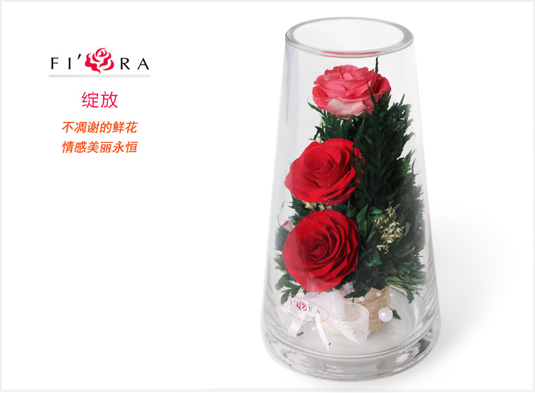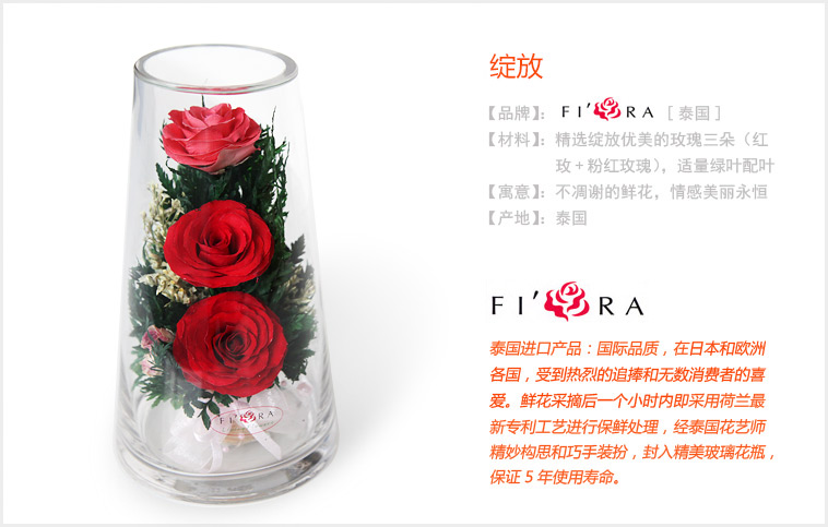 进口金字塔形花瓶保鲜花:精选绽放优美的玫瑰三枝(红玫+粉色玫瑰),配叶适量,在采摘后一个小时内用荷兰最新专利工艺处理,完整保留鲜花色泽和形态,经泰国花艺师精妙构思与巧手装扮,封入精美玻璃花瓶,保证产品使用寿命5年以上。