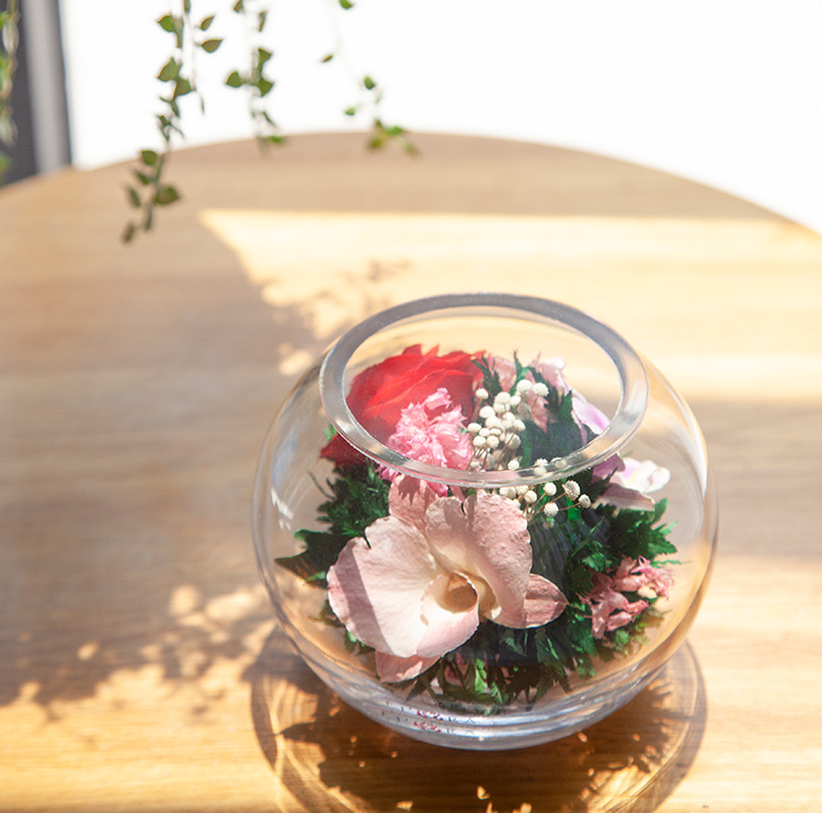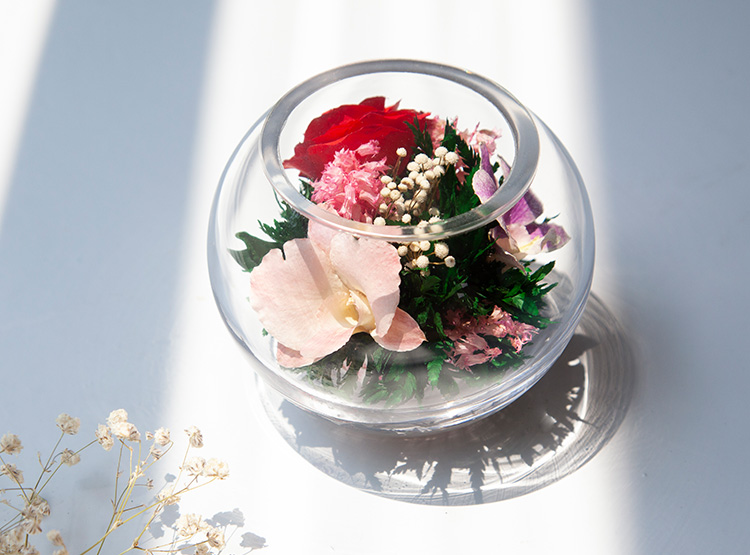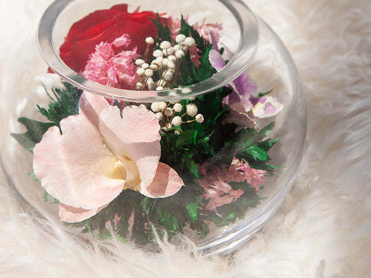 不凋谢泰国进口保鲜花:红玫瑰一朵,兰花两朵,搭配精致配花+配草,在采摘后一个小时内用荷兰最新专利工艺处理,完整保留鲜花色泽和形态,经泰国花艺师精妙构思与巧手装扮,封入精美玻璃花瓶,保证产品使用寿命5年以上。