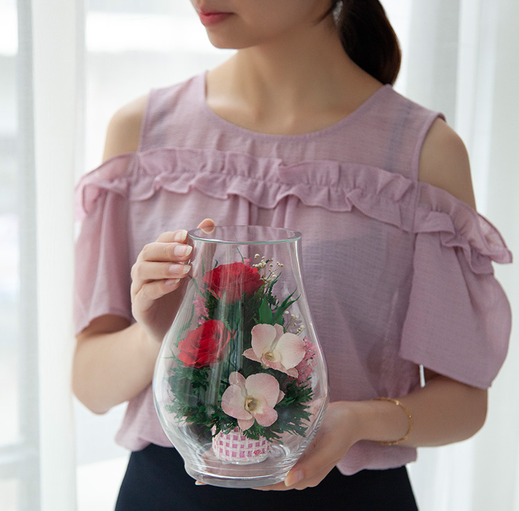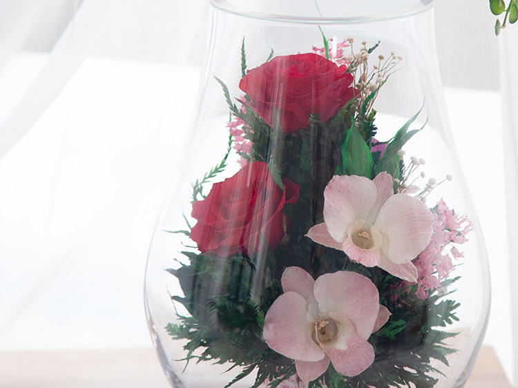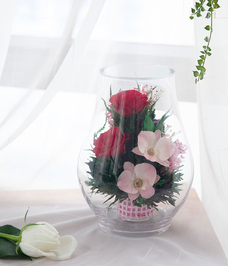 不凋谢泰国进口保鲜花:红玫瑰3朵,粉色紫色兰花4朵 搭配适量配花配草,在采摘后一个小时内用荷兰最新专利工艺处理,完整保留鲜花色泽和形态,经泰国花艺师精妙构思与巧手装扮,封入精美玻璃花瓶,保证产品使用寿命5年以上。