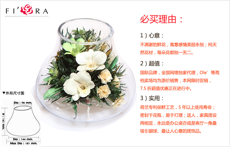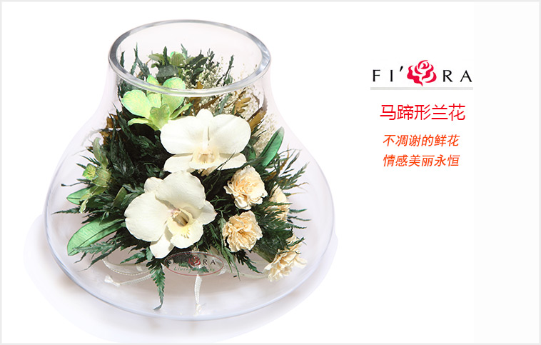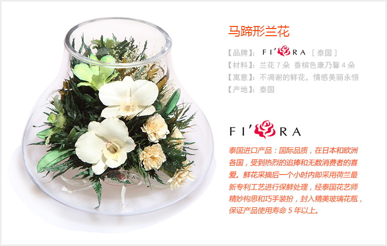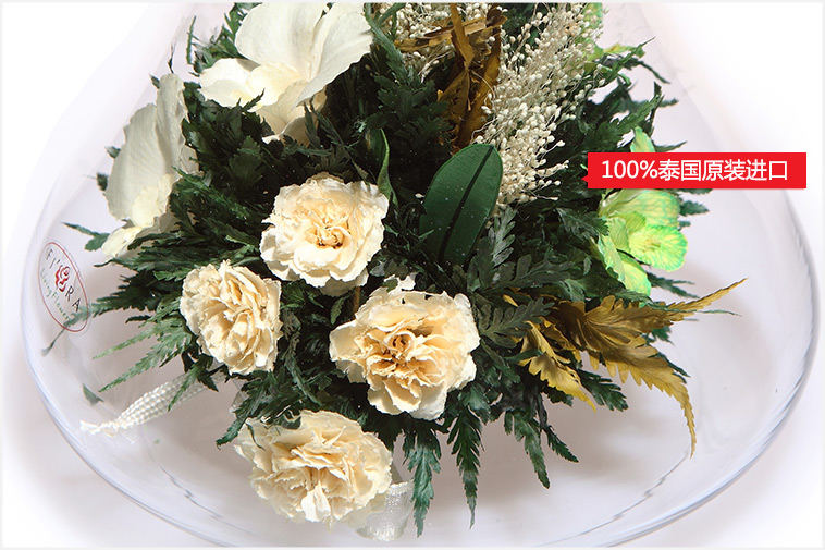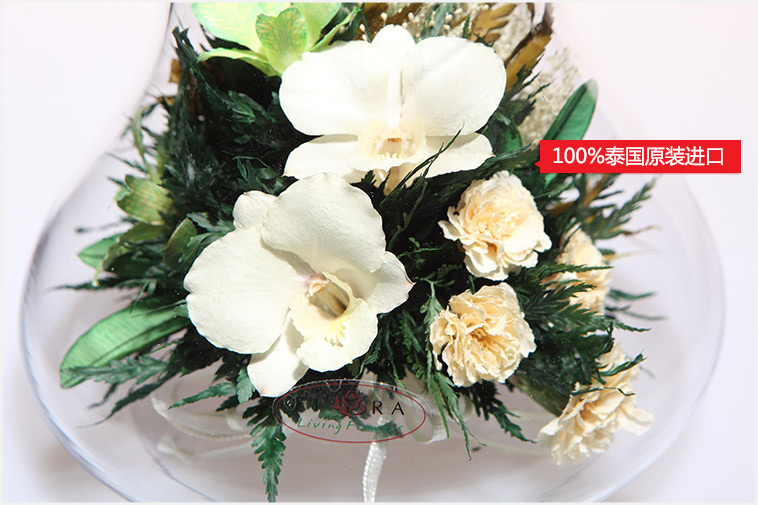 不凋谢泰国进口保鲜花:兰花7朵 香槟色康乃馨4朵,搭配精致配草,在采摘后一个小时内用荷兰最新专利工艺处理,完整保留鲜花色泽和形态,经泰国花艺师精妙构思与巧手装扮,封入精美玻璃花瓶,保证产品使用寿命5年以上。