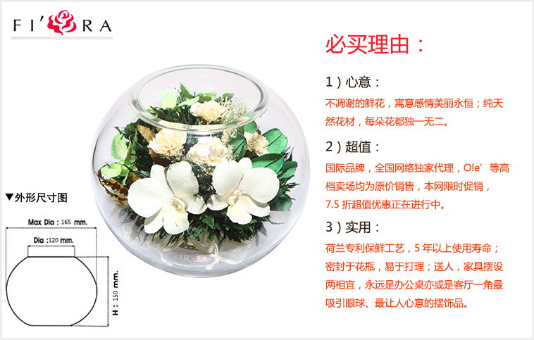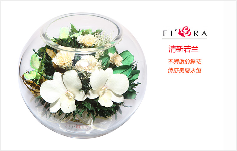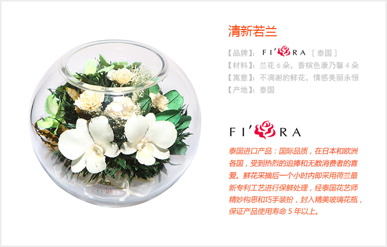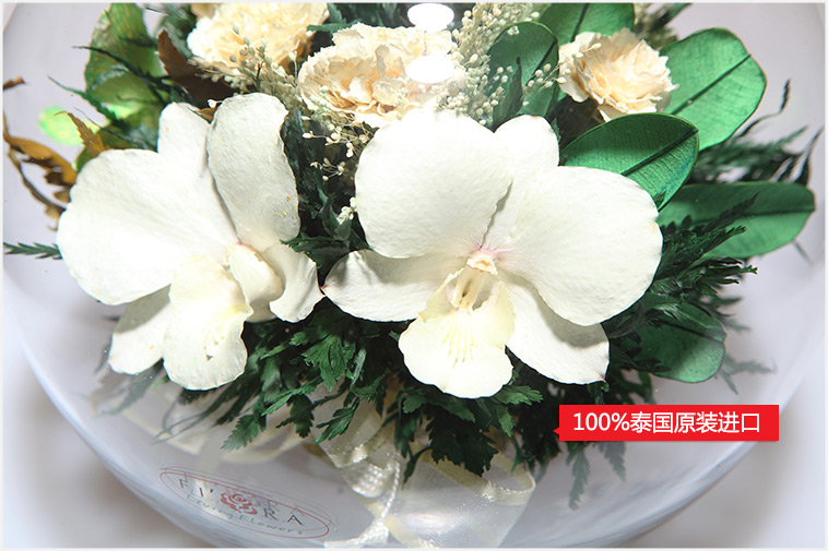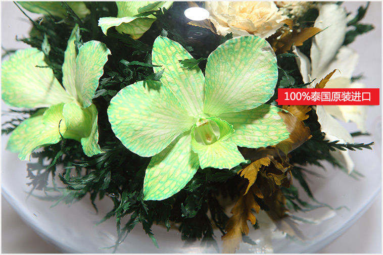 不凋谢泰国进口保鲜花:兰花6朵,香槟色康乃馨4朵,搭配精致配草,在采摘后一个小时内用荷兰最新专利工艺处理,完整保留鲜花色泽和形态,经泰国花艺师精妙构思与巧手装扮,封入精美玻璃花瓶,保证产品使用寿命5年以上。