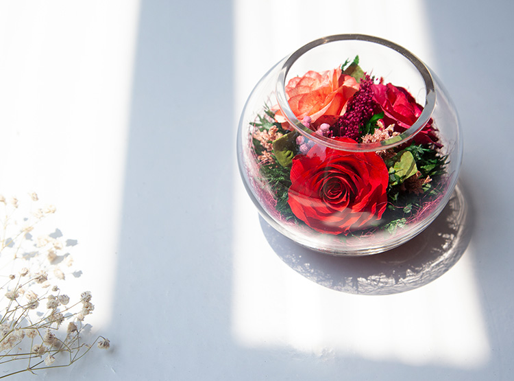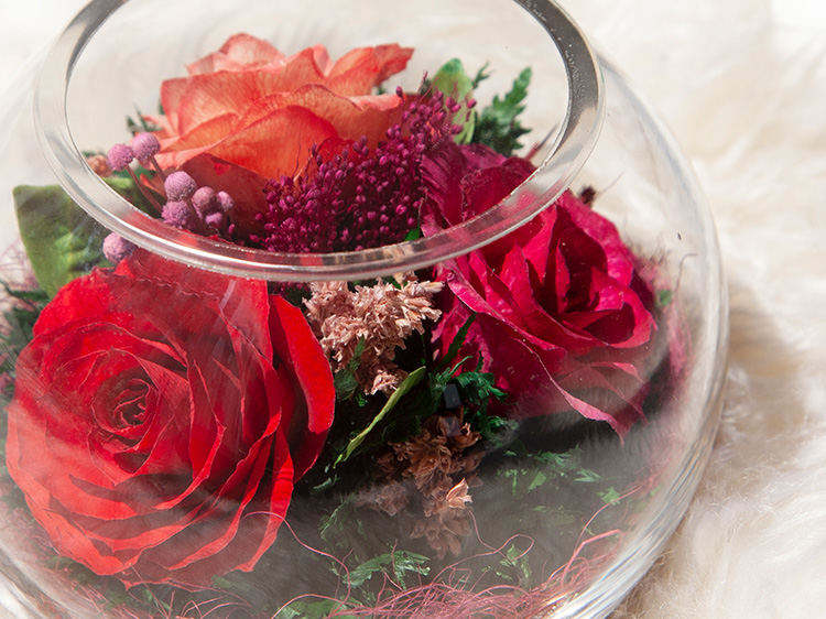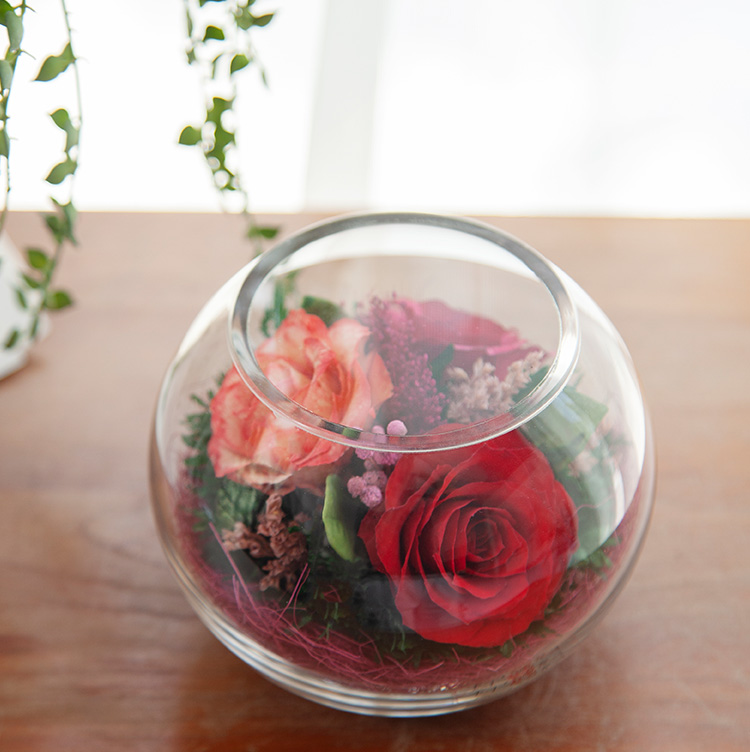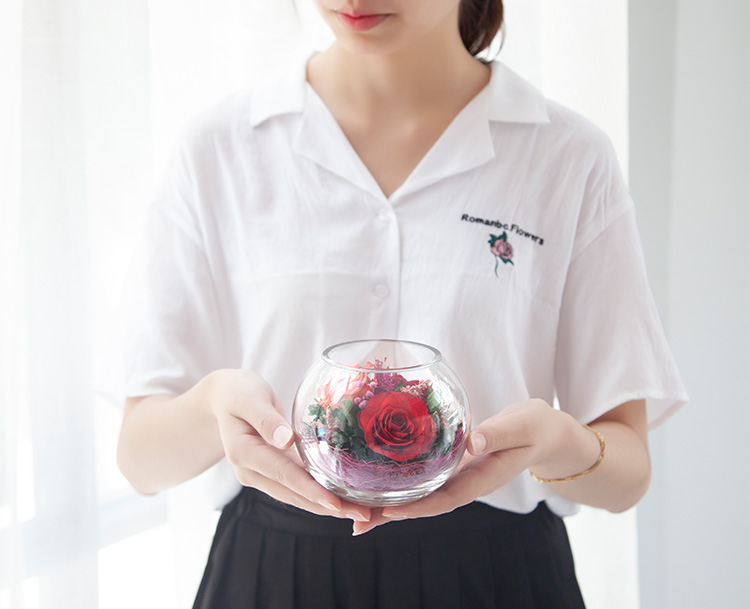 精选绽放优美的玫瑰三枝,配叶适量,在采摘后一个小时内用荷兰最新专利工艺处理,完整保留鲜花色泽和形态,经泰国花艺师精妙构思与巧手装扮,封入精美玻璃花瓶,保证产品使用寿命5年以上。
