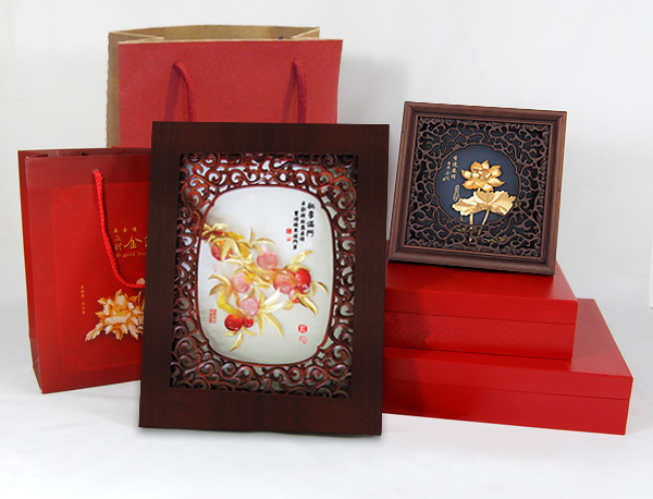 外框尺寸长34CM×宽27CM,画芯长20CM×宽15CM;礼盒、国家金银质量监督检测中心出具的检验证书、品牌保证卡、防伪标签、搭配手提袋。
