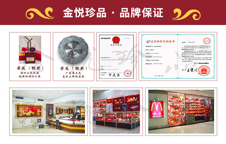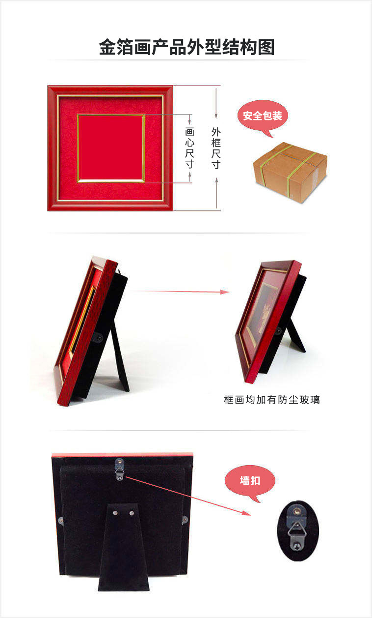 外框尺寸长25CM×宽20CM,画芯长12CM×宽8CM;礼盒、国家金银质量监督检测中心出具的检验证书、品牌保证卡、防伪标签、搭配手提袋。