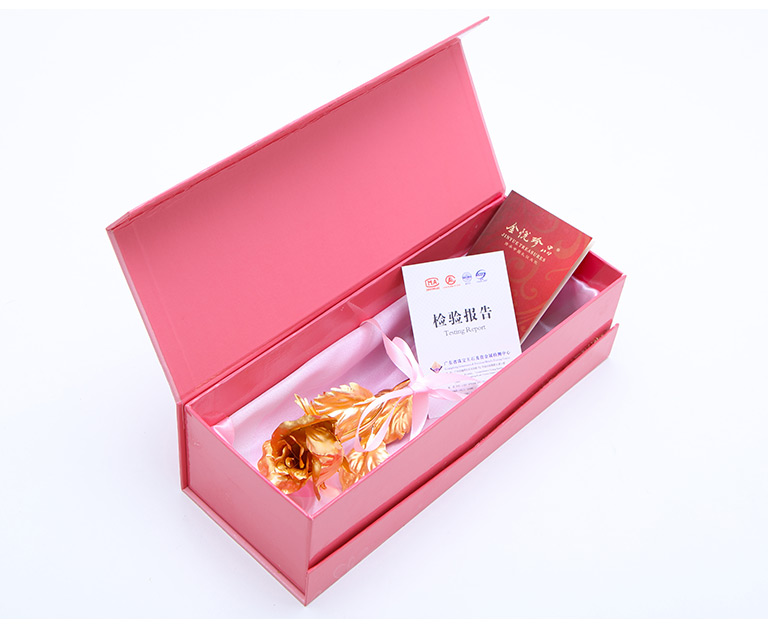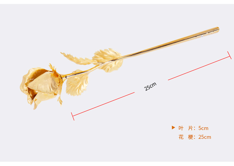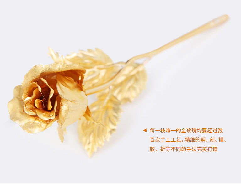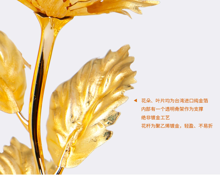 金箔玫瑰采用纯度99.9%千足金箔制作,花朵、叶片为纯金箔,内部有一个透明骨架作为支撑,绝非镀金工艺,花杆为聚乙烯镀金,轻盈、不易折。