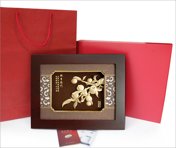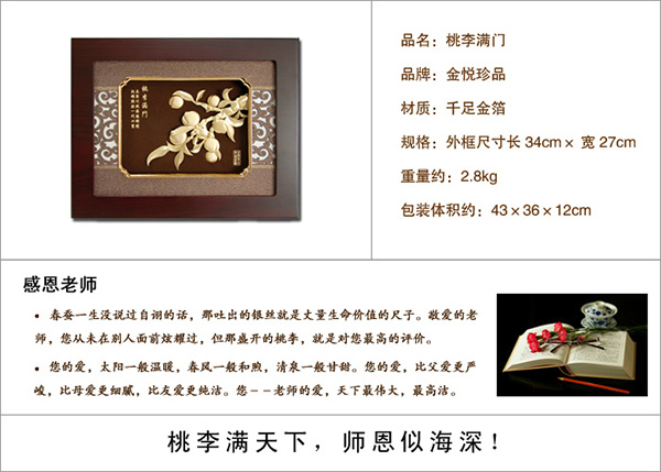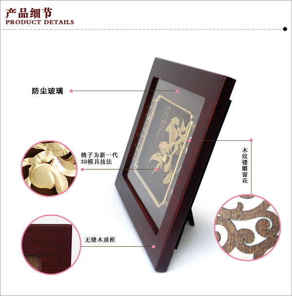 外框尺寸长34CM×宽27CM,画芯长22CM×宽18CM;礼盒、国家金银质量监督检测中心出具的检验证书、品牌保证卡、防伪标签、搭配手提袋。