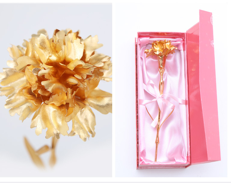 金箔康乃馨采用纯度99.9%千足金箔制作,花朵、叶片为纯金箔,内部有一个透明骨架作为支撑,绝非镀金工艺,花杆为聚乙烯镀金,轻盈、不易折。