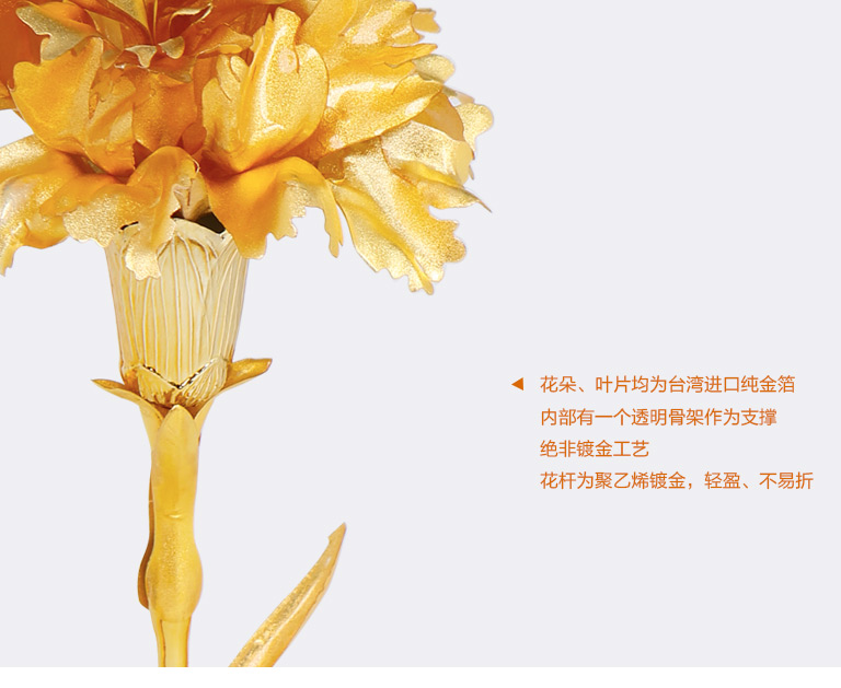 金箔康乃馨采用纯度99.9%千足金箔制作,花朵、叶片为纯金箔,内部有一个透明骨架作为支撑,绝非镀金工艺,花杆为聚乙烯镀金,轻盈、不易折。
