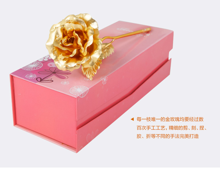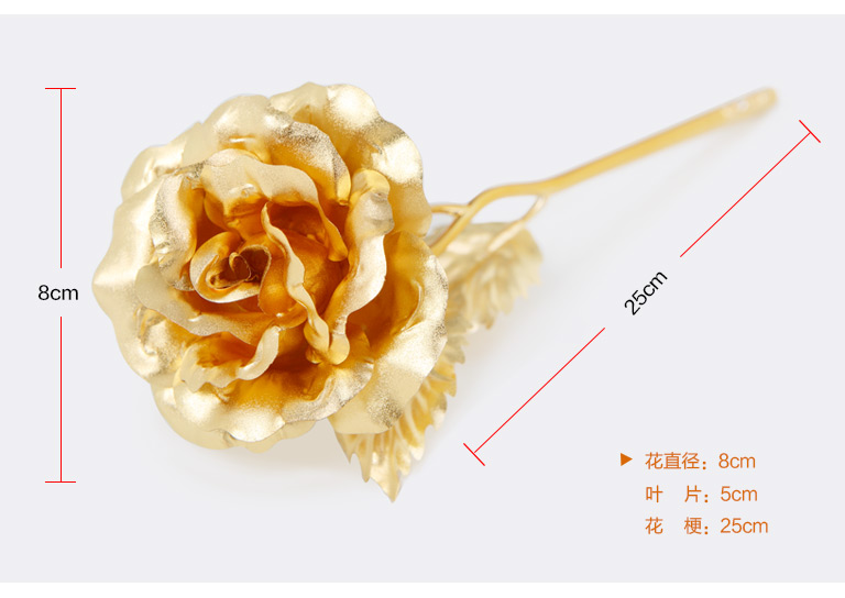 金箔玫瑰采用纯度99.9%千足金箔制作,花朵、叶片为纯金箔,内部有一个透明骨架作为支撑,绝非镀金工艺,花杆为聚乙烯镀金,轻盈、不易折。