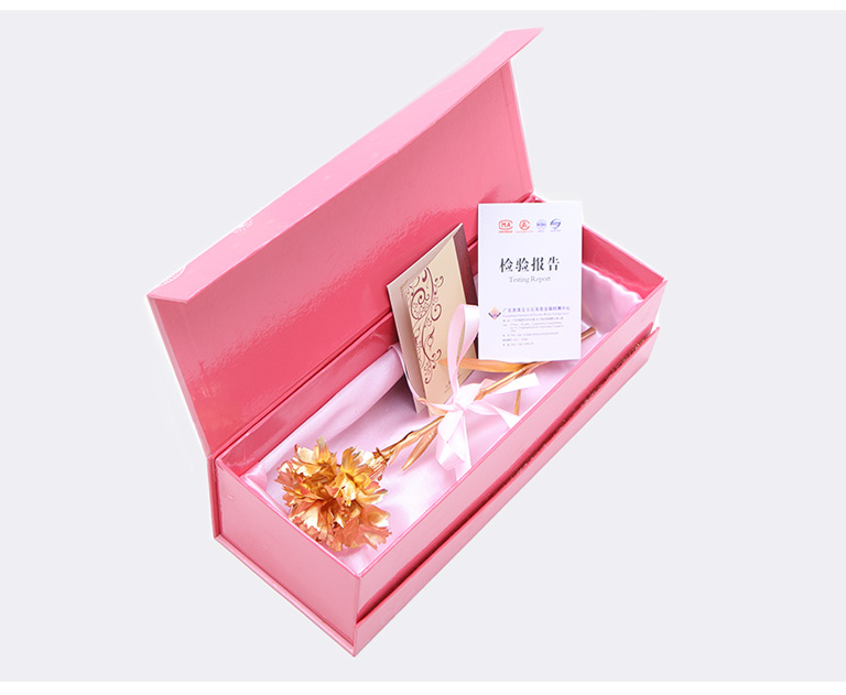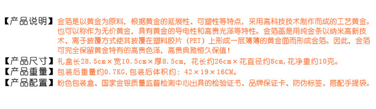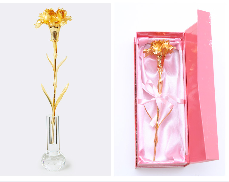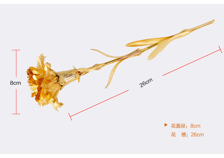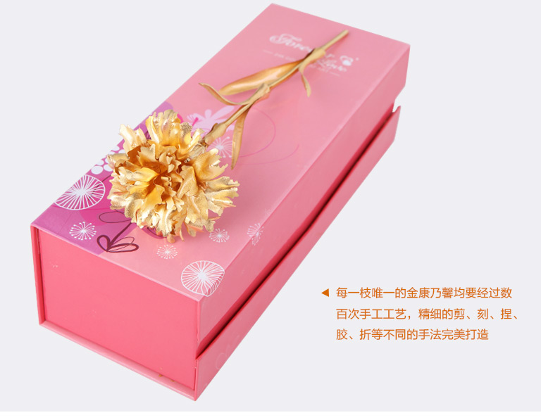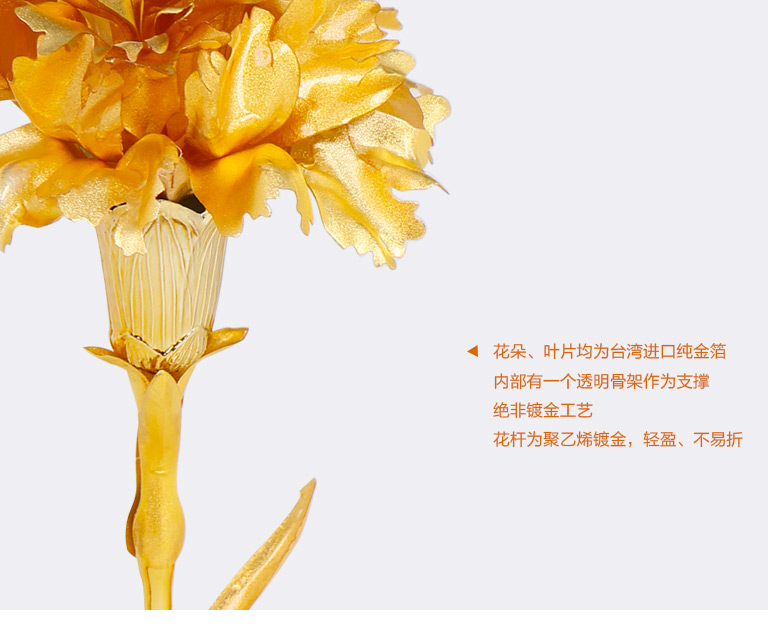 金箔康乃馨采用纯度99.9%千足金箔制作,花朵、叶片为纯金箔,内部有一个透明骨架作为支撑,绝非镀金工艺,花杆为聚乙烯镀金,轻盈、不易折。