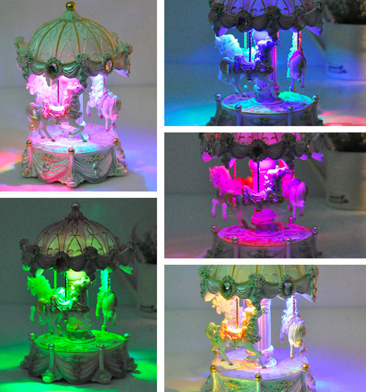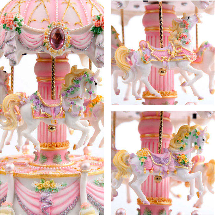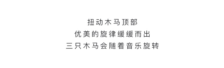 三只小木马,精致美观,形态各异;高档树脂材质,宝贝整体雕有精美花纹,镶有亮钻,彩珠;内部音乐机芯为十八音韵升机芯;顶部为音乐发条,扭动就有音乐响起。