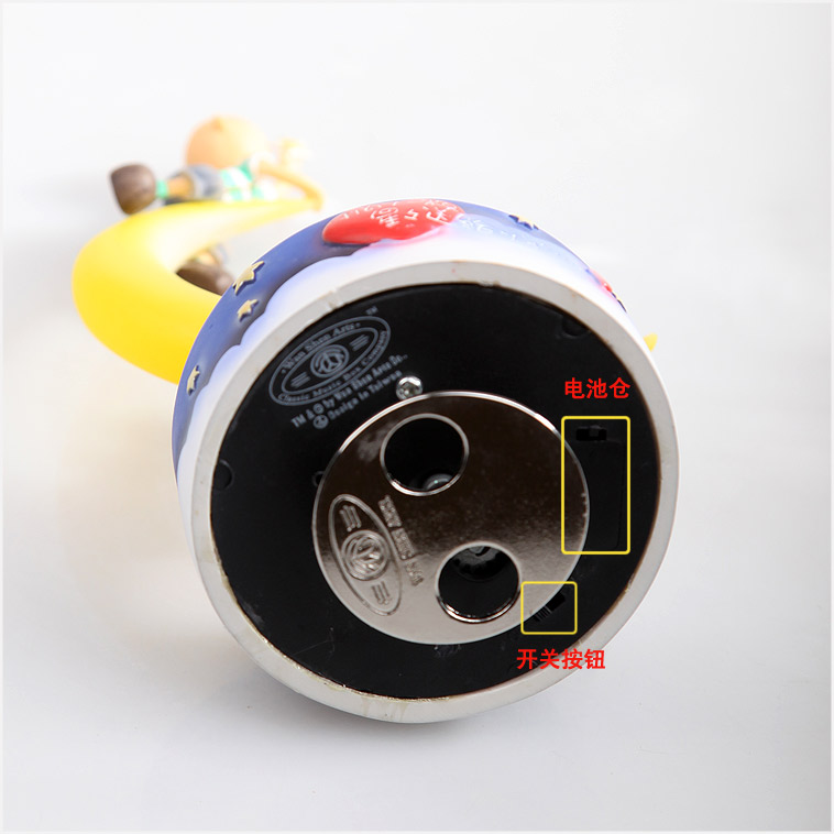 里面装有三颗纽扣电池 打开开关 扭动发条 有音乐的同时还可以发光喔
