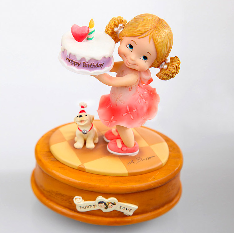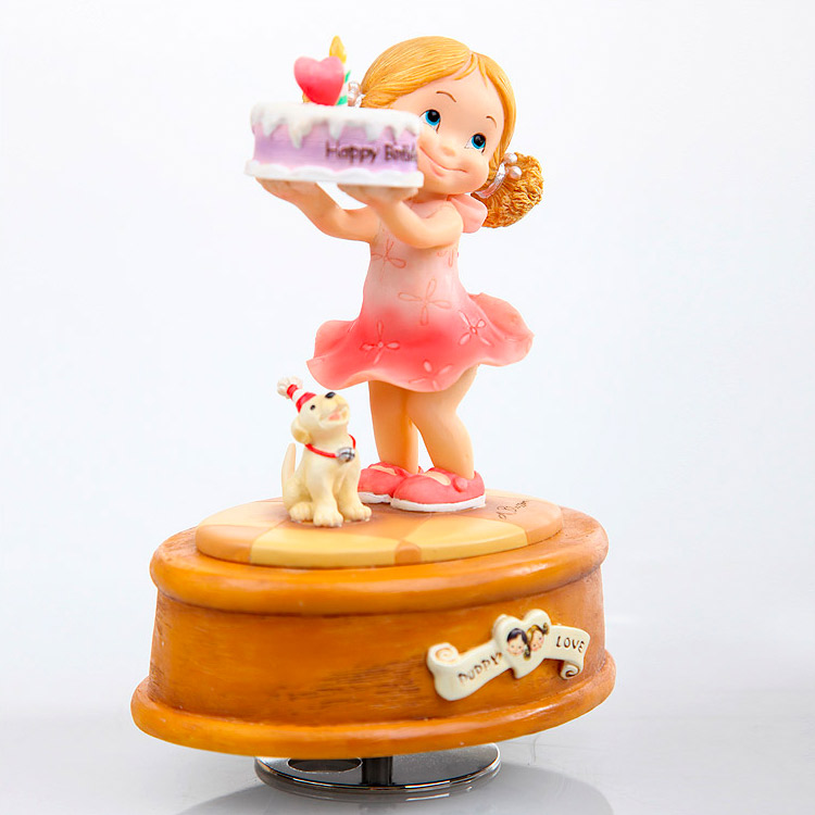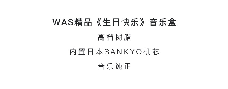 WAS精品音乐盒摆饰,高档树脂材质,内置日本sankyo机芯,音乐纯正。色彩鲜艳,设计创意,卡通人物造型,表情生动,超级可爱,做工精细...宝贝底部转盘即音乐发条,扭动发条,音乐响起,宝贝整体还会旋转。曲目:《生日快乐》