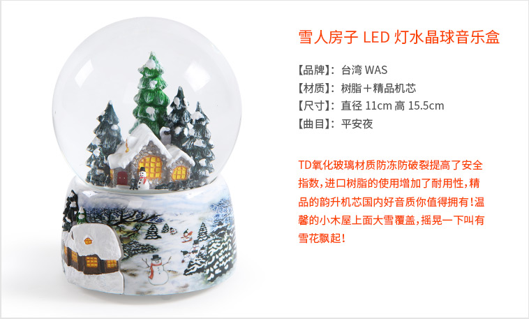 WAS精品100mm水球音乐盒,陶瓷底座+高档树脂材质,音乐纯正。色彩鲜艳,设计创意,雪人房子造型,可爱生动,做工精细...宝贝底部转盘即音乐发条,扭动发条,音乐响起,宝贝整体还会旋转。曲目:《平安夜》