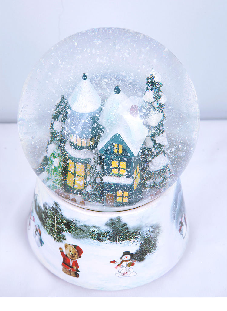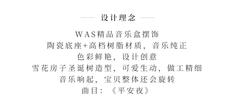 WAS精品120mm水球音乐盒,陶瓷底座+高档树脂材质,音乐纯正。色彩鲜艳,设计创意,雪花房子圣诞树造型,可爱生动,做工精细...底部转盘即音乐发条,扭动发条,音乐响起,宝贝整体还会旋转。曲目:《平安夜》