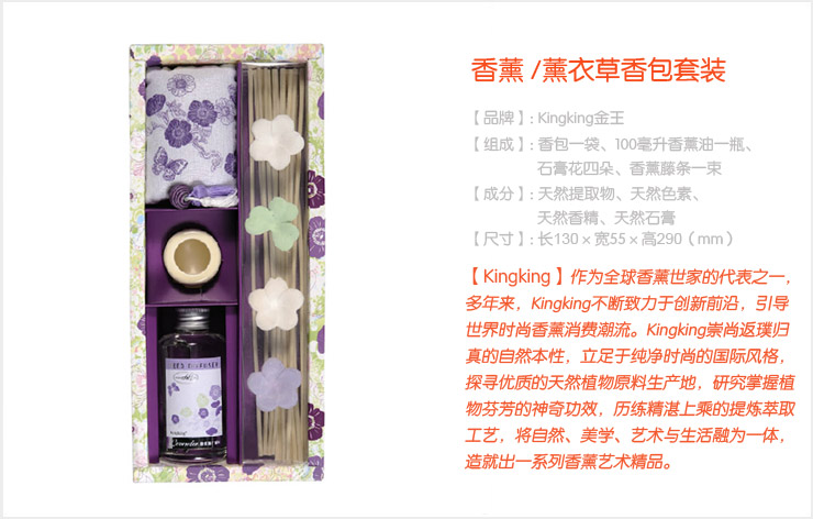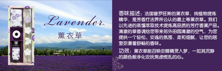 香味描述: 法国普罗旺斯的薰衣草,纯植物提炼精华,是芳香疗法界所公认的最上等薰衣草。清澈的草香调给您带来郊外田园清澈的空气,为您提供一个轻松、安逸的氛围,柔和细腻,让您的居室弥漫着舒畅的香味。