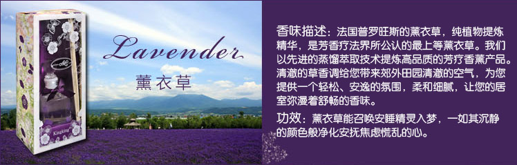 香味描述: 法国普罗旺斯的薰衣草,纯植物提炼精华,是芳香疗法界所公认的最上等薰衣草。清澈的草香调给您带来郊外田园清澈的空气,为您提供一个轻松、安逸的氛围,柔和细腻,让您的居室弥漫着舒畅的香味。