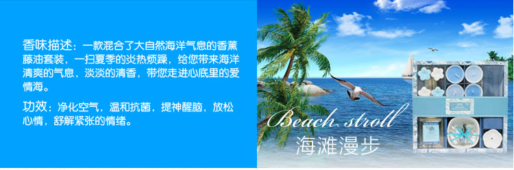香味描述: 一款混合了大自然海洋气息的香薰藤油套装,一扫夏季的炎热烦躁,给您带来海洋清爽的气息,淡淡的清香,带您走进心底里的爱情海。