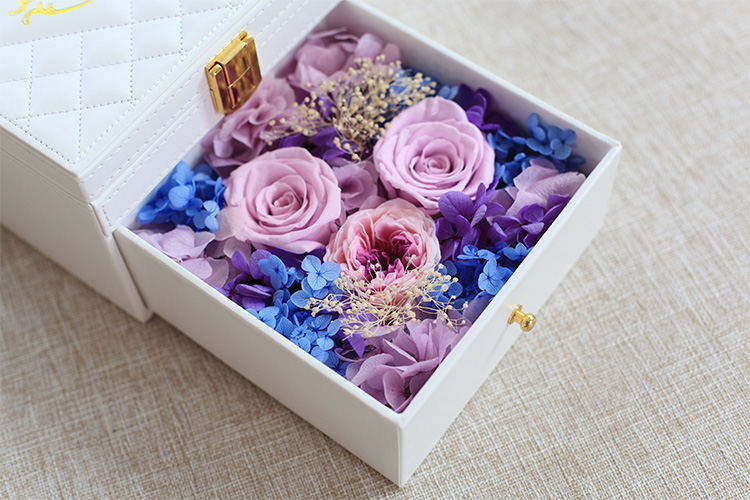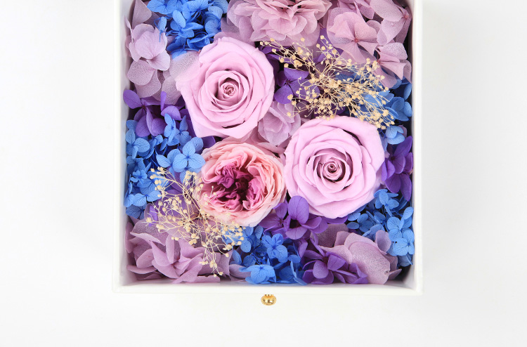 永生花:永生紫玫瑰(直径5-6cm)2朵,粉紫色奥斯丁1朵,搭配各色绣球、满天星