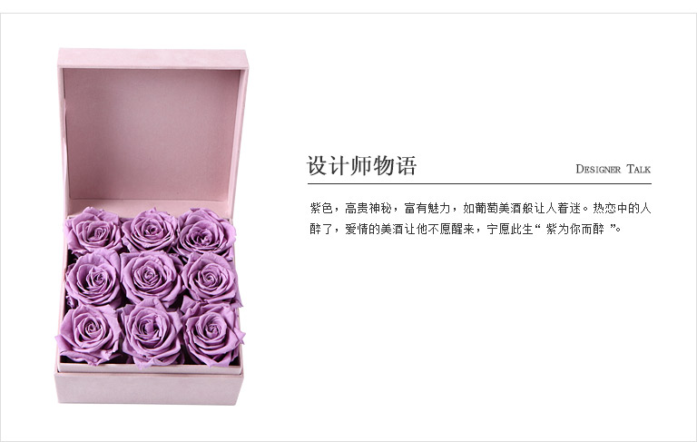 FlowerSong系列永生花盒:厄瓜多尔进口紫色永生玫瑰9枝(直径7.5-9cm)