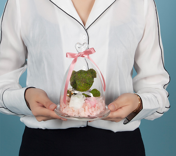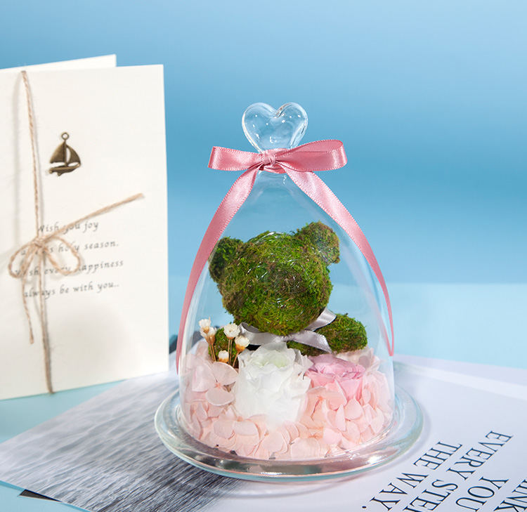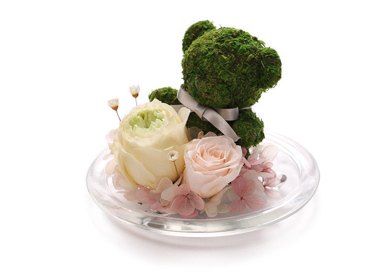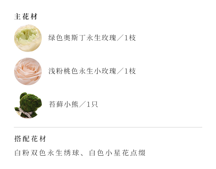 苔藓小熊1只,绿色奥斯丁永生玫瑰,浅粉桃色永生小玫瑰,白粉双色永生绣球,白色小星花点缀。