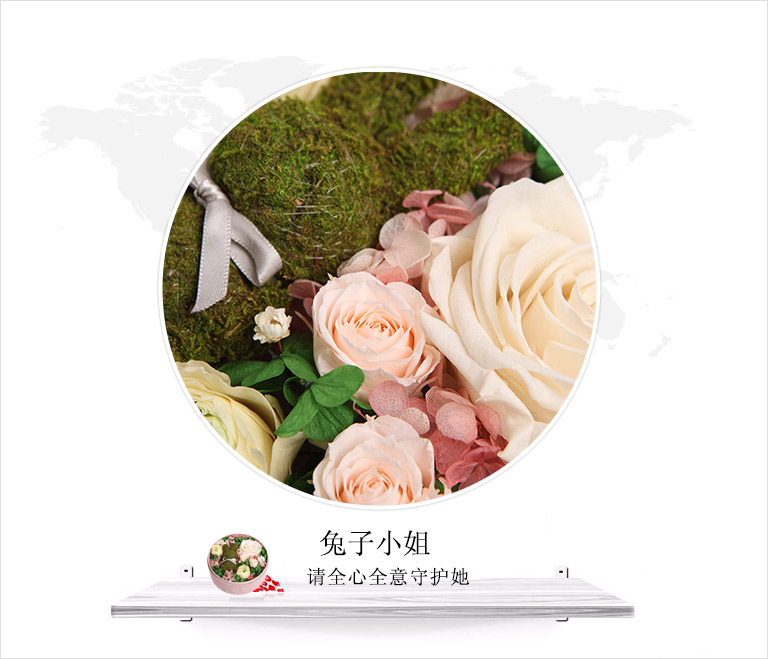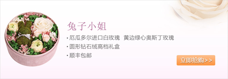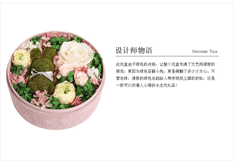 FlowerSong系列永生花盒:厄瓜多尔进口白玫瑰1朵(直径7.5-9cm),黄边绿心奥斯丁玫瑰2朵,粉桃色小玫瑰2朵,苔藓小兔1只,搭配进口绿色绣球,白粉双色绣球