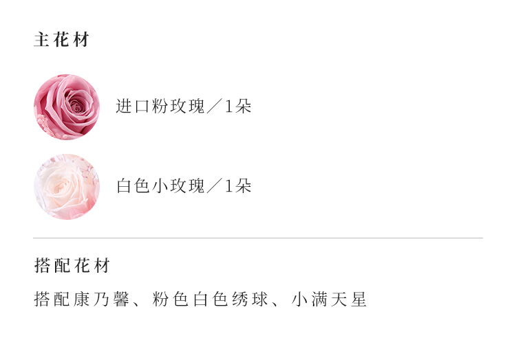 进口粉色永生玫瑰1枝,小玫瑰1枝,搭配粉色白色绣球、小满天星