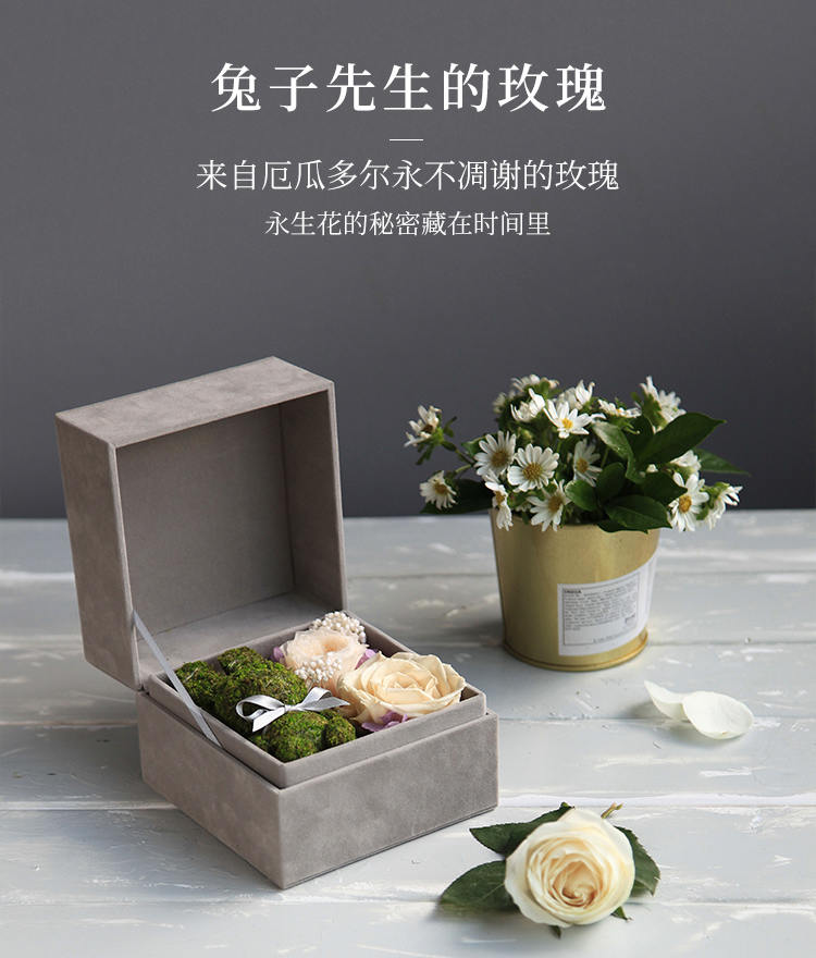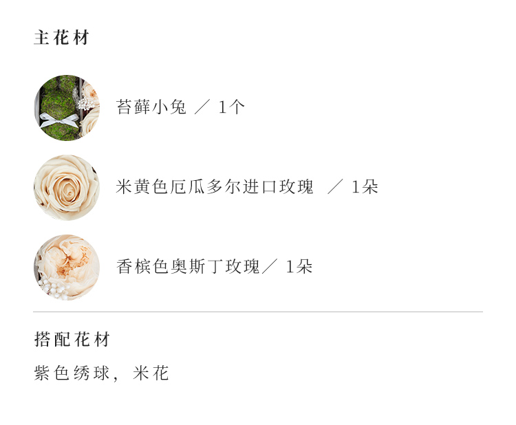 [限时热卖价99元,中通包邮] 苔藓小兔,米黄色厄瓜多尔进口玫瑰1朵,香槟色奥斯丁玫瑰1朵