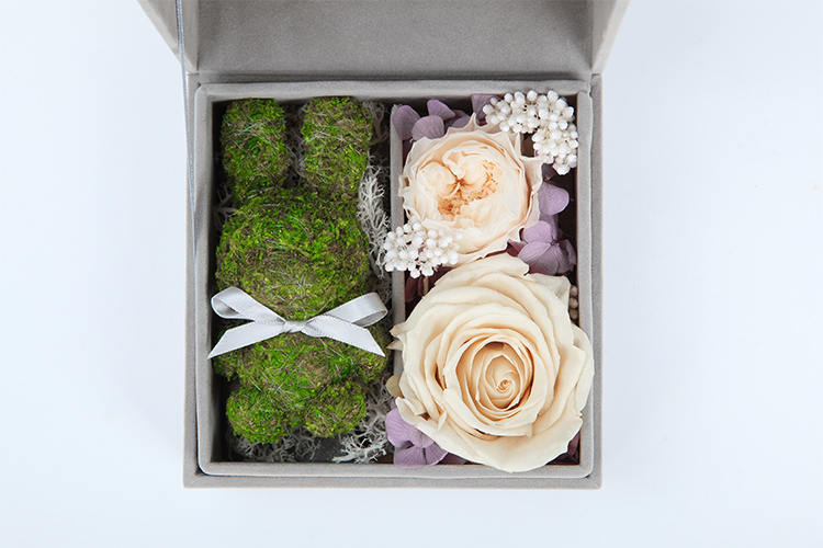 苔藓小兔,米黄色厄瓜多尔进口玫瑰1朵,香槟色奥斯丁玫瑰1朵,搭配紫色绣球,米花