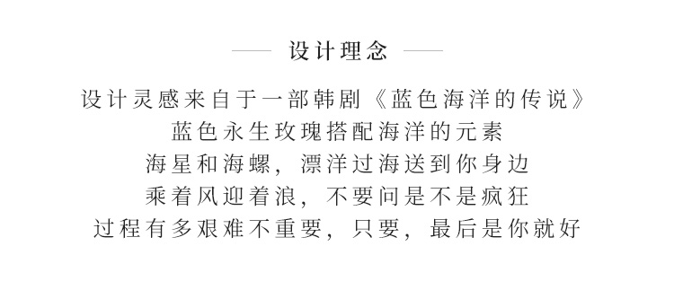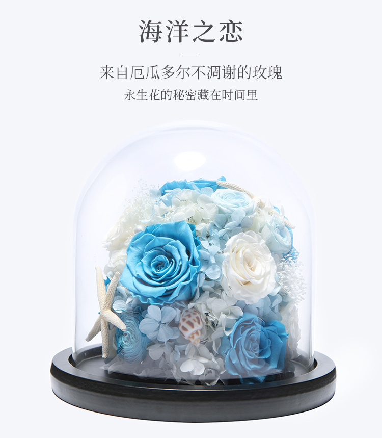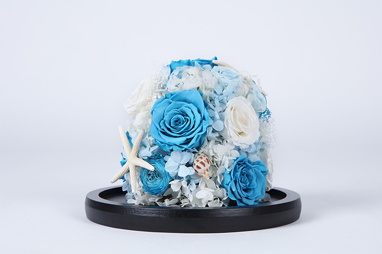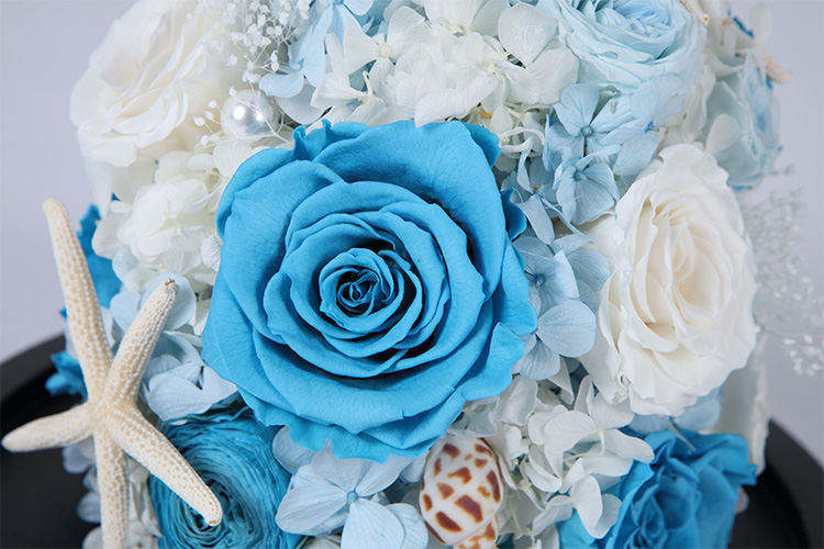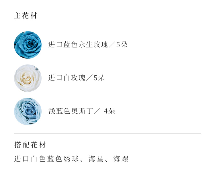 进口蓝色永生玫瑰5朵(直径6-7cm),进口白玫瑰5朵(直径4-5cm),浅蓝色奥斯丁4朵,搭配进口白色蓝色绣球、海星、海螺