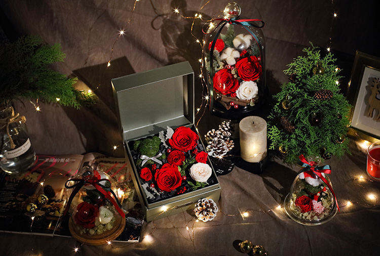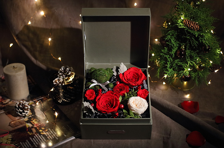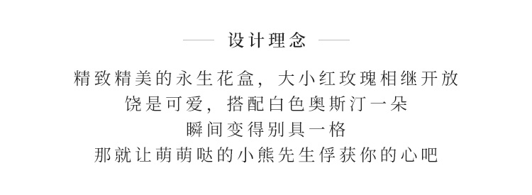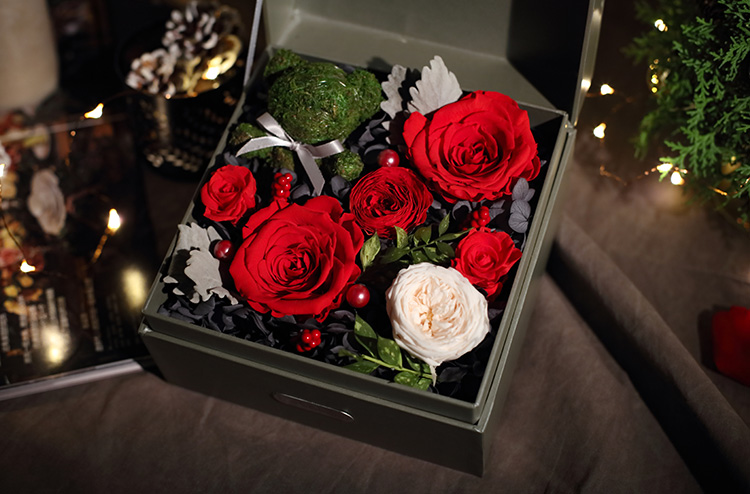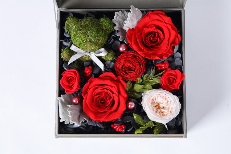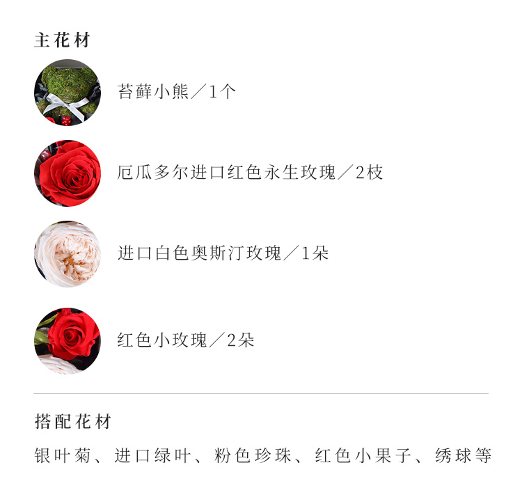 苔藓小熊1个,厄瓜多尔进口红色永生玫瑰(直径6-7cm)2枝,进口白色奥斯汀玫瑰1朵,红色小玫瑰2朵,银叶菊4片,进口绿色叶子2枝,粉色珍珠3颗,红色小果子3枝,搭配适量黑色绣球