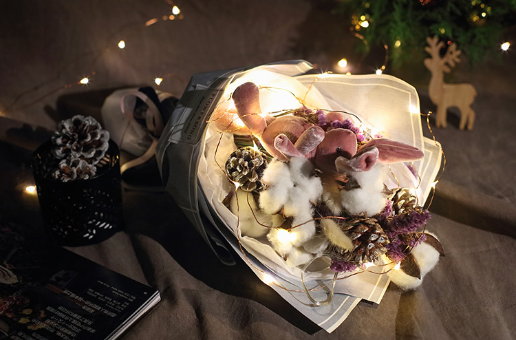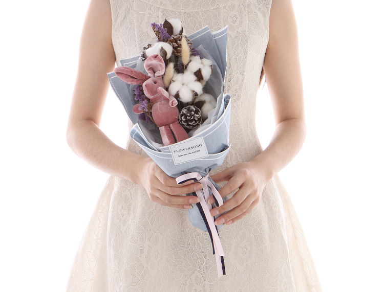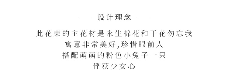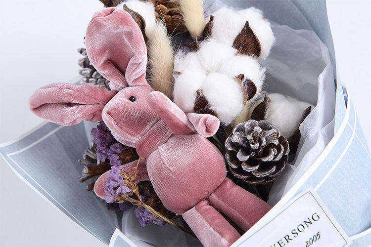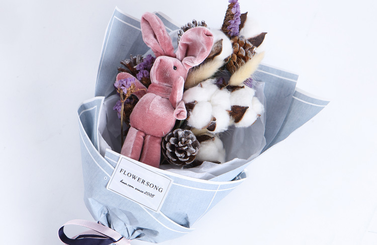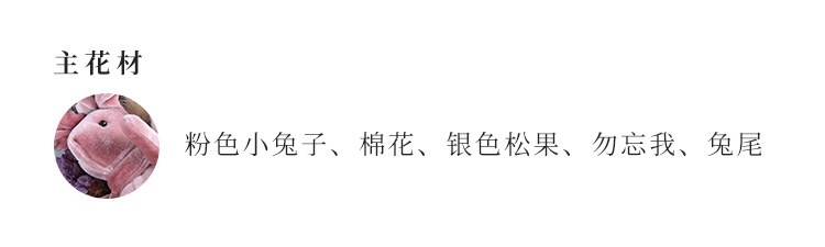 粉色小兔子1个,棉花3朵,银色松果4颗,紫色勿忘我2枝,兔尾2枝