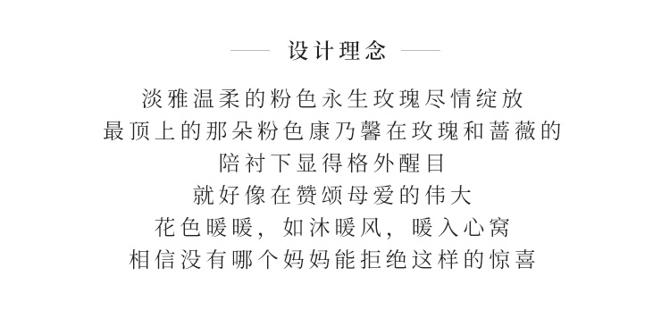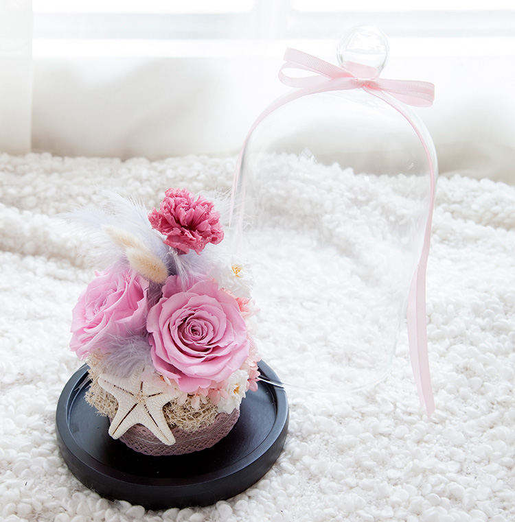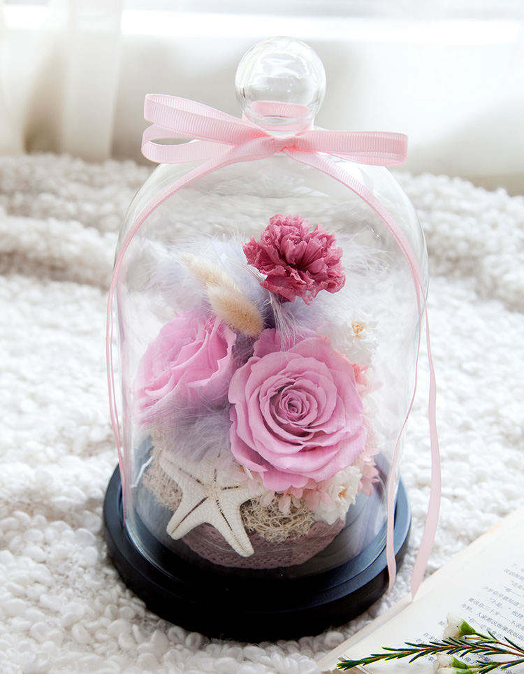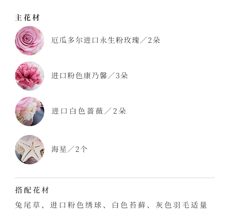厄瓜多尔进口永生粉玫2朵(直径6-7CM)、进口白色蔷薇2朵、海星2个、进口粉色康乃馨3朵、兔尾草2个、进口粉色绣球适量、白色苔藓适量、灰色羽毛适量