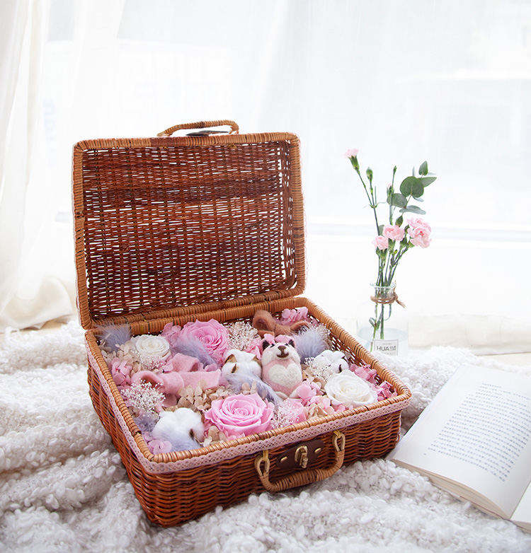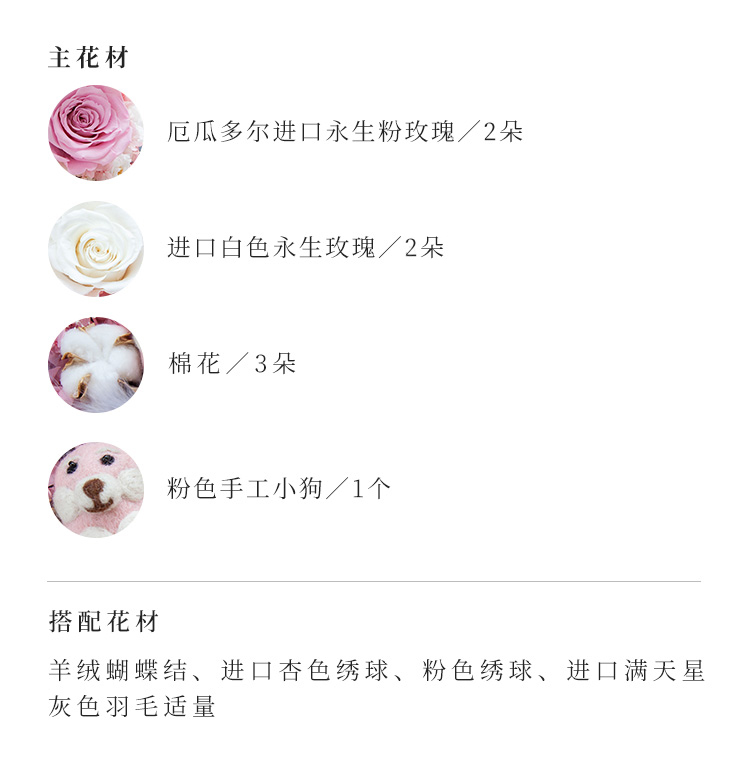 厄瓜多尔进口永生粉玫2朵(直径6-7CM)、进口白色永生玫瑰2朵(直径3-4cm)、棉花3朵、粉色手工小狗1个、羊绒蝴蝶结2个、进口杏色绣球适量、粉色绣球适量、进口满天星适量、灰色羽毛适量