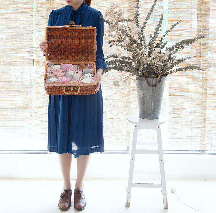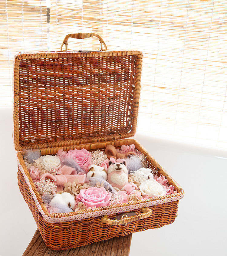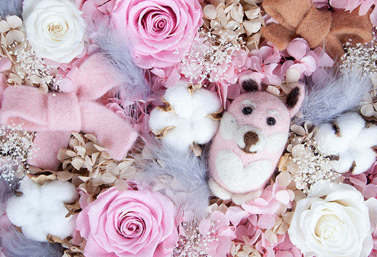 [超cute梦幻童话世界] 厄瓜多尔进口永生粉玫2朵、进口白色永生玫瑰2朵、棉花3朵、粉色手工小狗1个