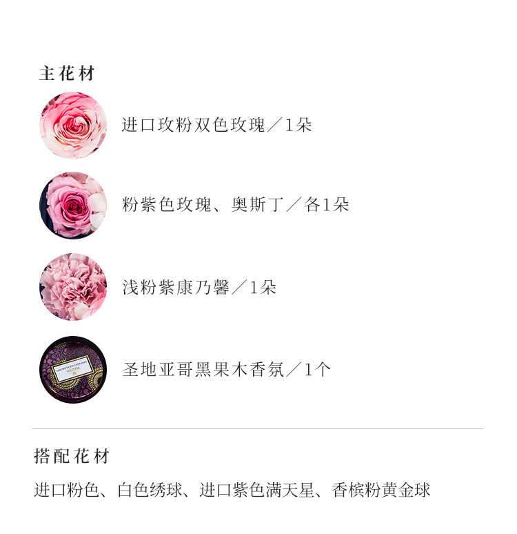 立减8元日本进口大地玫粉双色玫瑰1朵,粉紫色玫瑰1朵,浅粉紫康乃馨1朵,粉紫色奥斯丁1朵,香槟粉黄金球1朵,粉色绣球适量、白色绣球适量,紫色渐变满天星适量;美国进口Voluspa香氛1盒(Voluspa起源于美国南加州,好莱坞巨星们是常客!由于味道好闻颜值又高,VOLUSPA还经常成为奥斯卡、格莱美等颁奖典礼的伴手礼。依循欧洲古老传统的制蜡配方,添加只从天然植物、水果和香料中萃取的精油,闻起来舒服自然。)